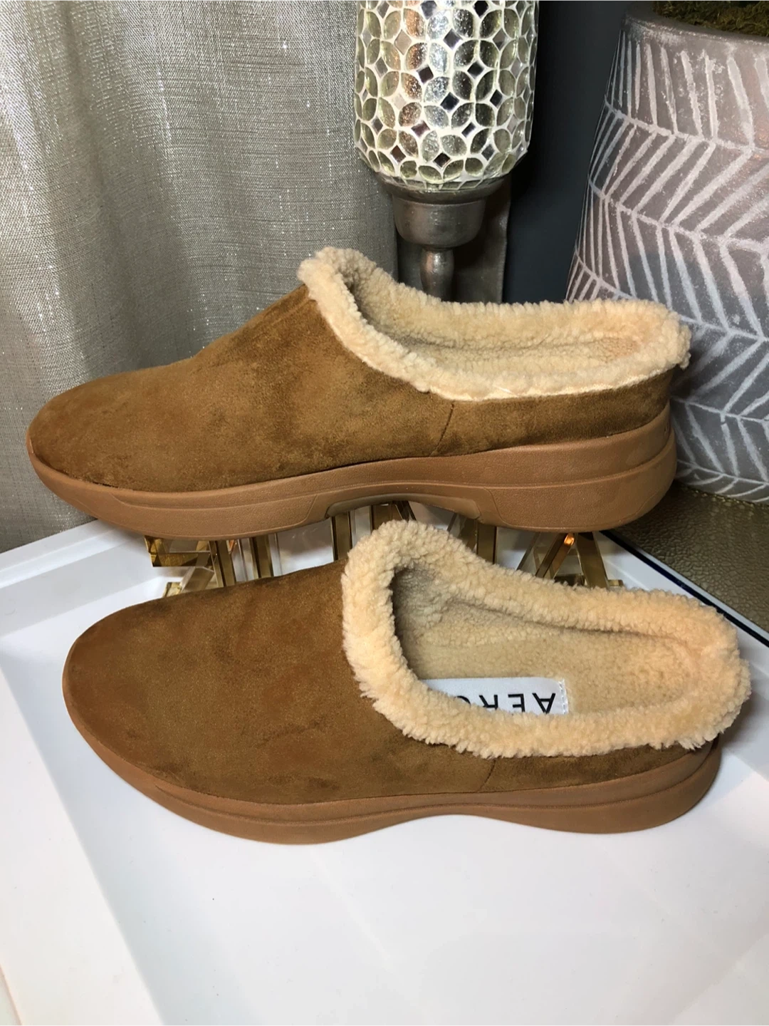 37Cozy up with these Aerosoles clogs! They feature a soft brown suede exterior and a warm shearling lining, perfect for keeping your feet comfy and stylish. These are great for indoor and outdoor use