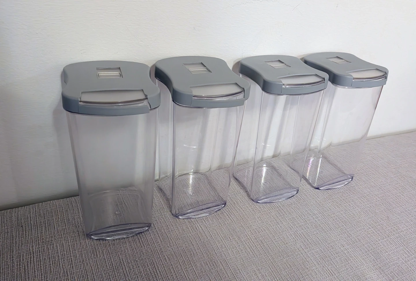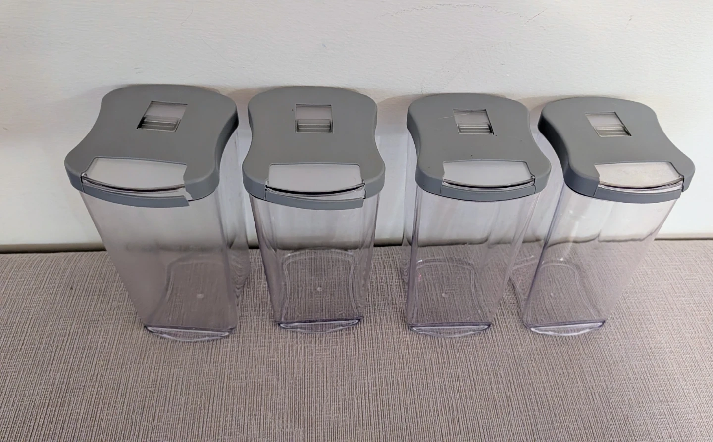 Selling a set of four clear food storage containers! They're in great shape and ready to help you organize your pantry or fridge. Perfect for storing dry goods, snacks, or leftovers. They have gray lids.