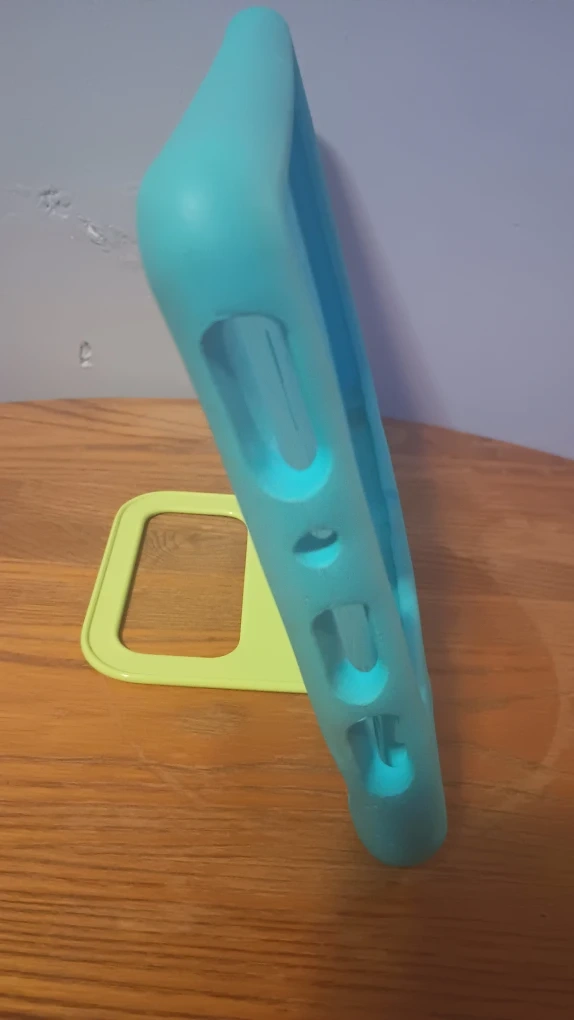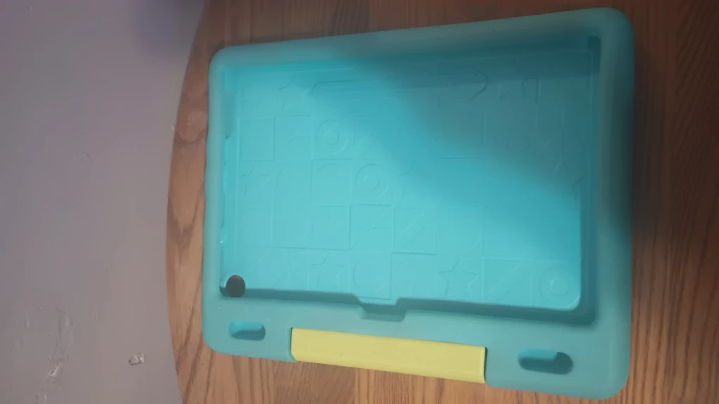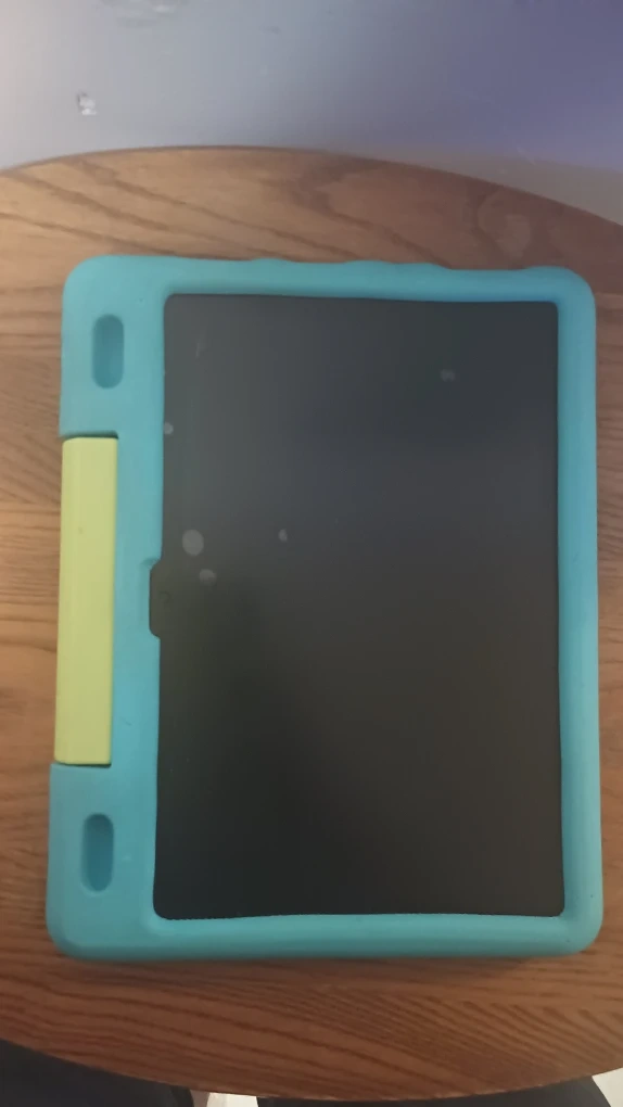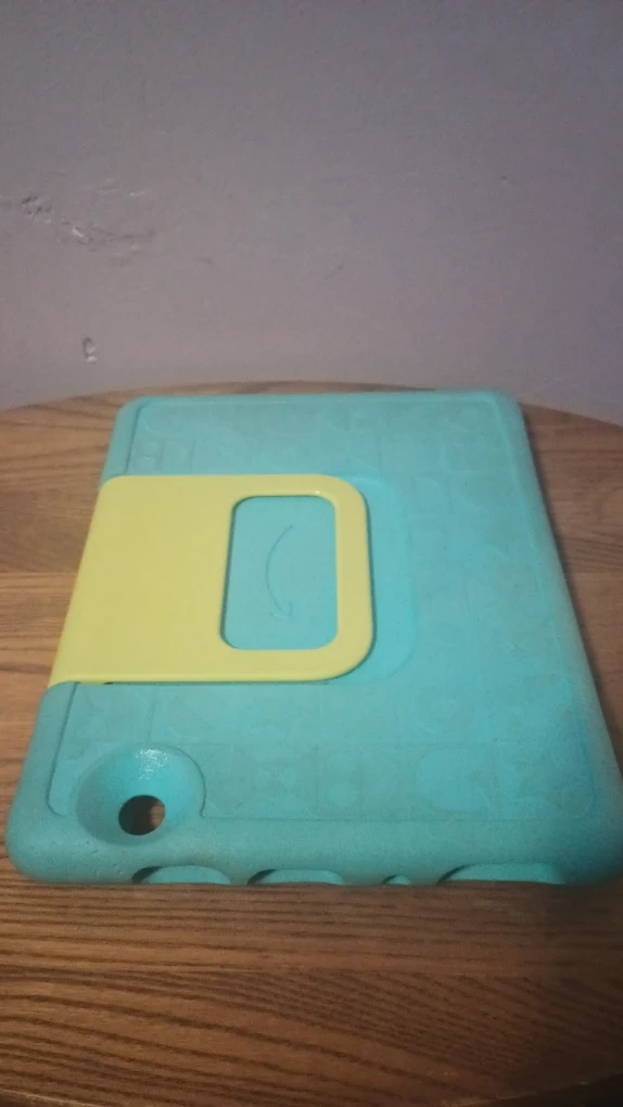 Selling an Amazon Fire HD 10 tablet. It comes with a kid-proof case, perfect for keeping it safe from bumps and drops! The case is a fun teal color with a yellow handle. Great for kids!