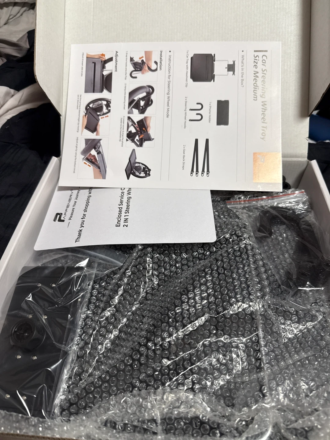 60Selling a medium-sized AFFENERY steering wheel tray with a phone holder. It's brand new and still in the box! It can be installed on the steering wheel or on the back of the seat. The height and angle are adjustable.