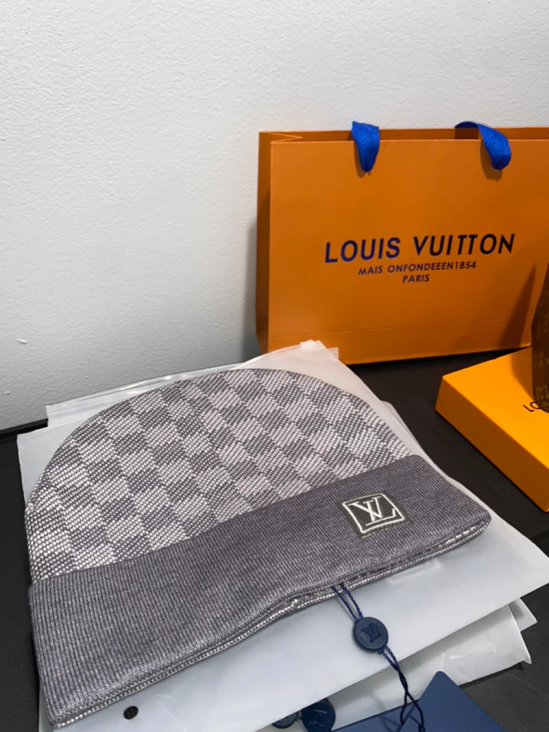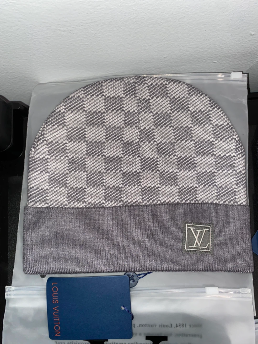 Stylish natural colored gray Louis Vuitton beanie featuring the iconic Damier pattern. Brand new and ready to keep you warm! Perfect for adding a touch of luxury to your winter wardrobe. Very nice gift!!!