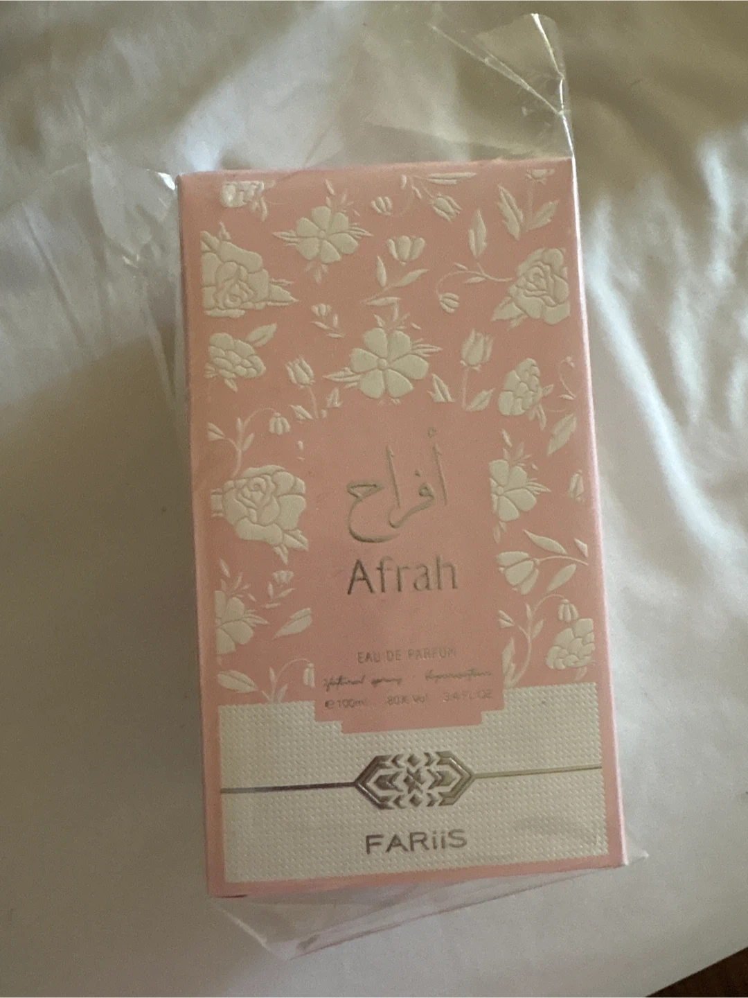 Selling a new bottle of Afrah Eau de Parfum by Fariis! It's a 3.4 fl oz bottle, still in its original packaging. The box is a lovely light pink with a floral design. Perfect for anyone looking for a new fragrance!