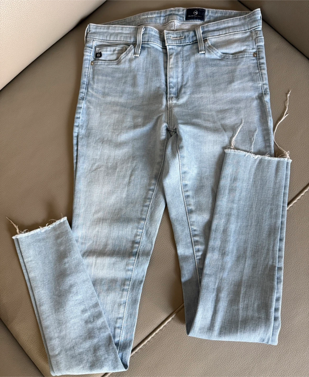85Selling a pair of AG Middi Ankle jeans in a light wash denim. Mid rise. Fairly new condition and ready for a new home! The ankle has a cute raw hem detail.
