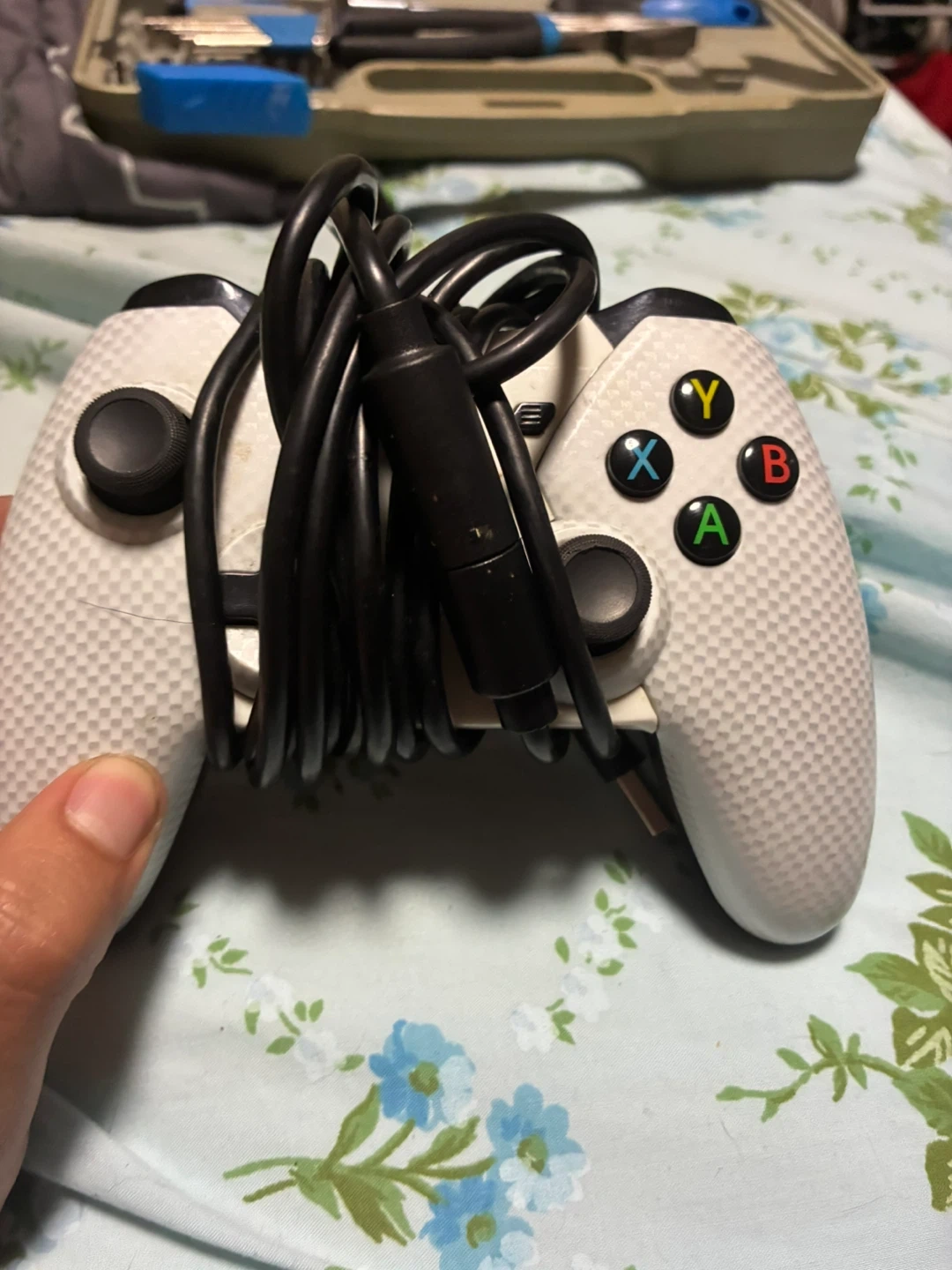This is a wired controller for Xbox. It's white with a textured grip and has the standard A, B, X, Y buttons. Includes the USB cable for connection.