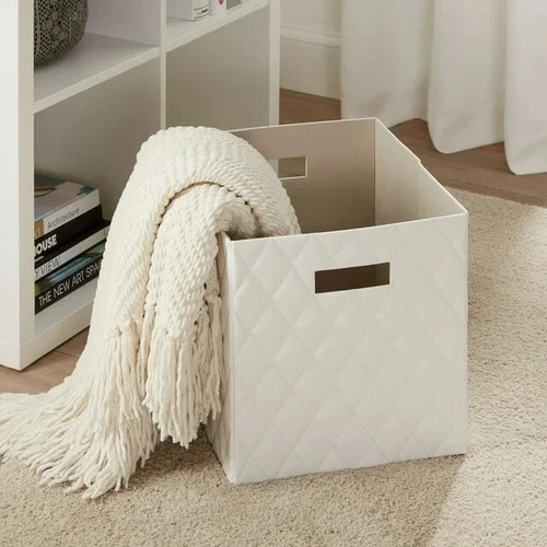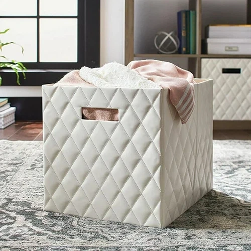 These sleek storage cubes are crafted of faux leather and are ideal for use in bedrooms, bathrooms, child's rooms, craft rooms, offices, classrooms, and more. They have two side handles to make transport easy. The bins can hold and organize a variety of objects, such as magazines, trinkets, small toys, and craft supplies. Each bin measures 12.75" x 15" x 12.75". They come in a chic woven exterior with a tassel finish. Perfect for keeping toys, accessories, blankets, and books accessible but out of sight. Use in tandem with the Better Homes and Gardens Cube Organizer. For best results, wipe clean with a damp cloth.