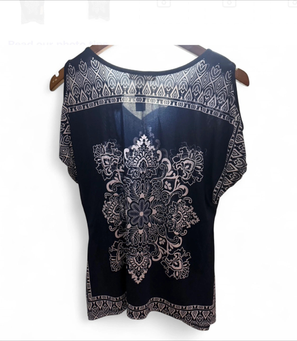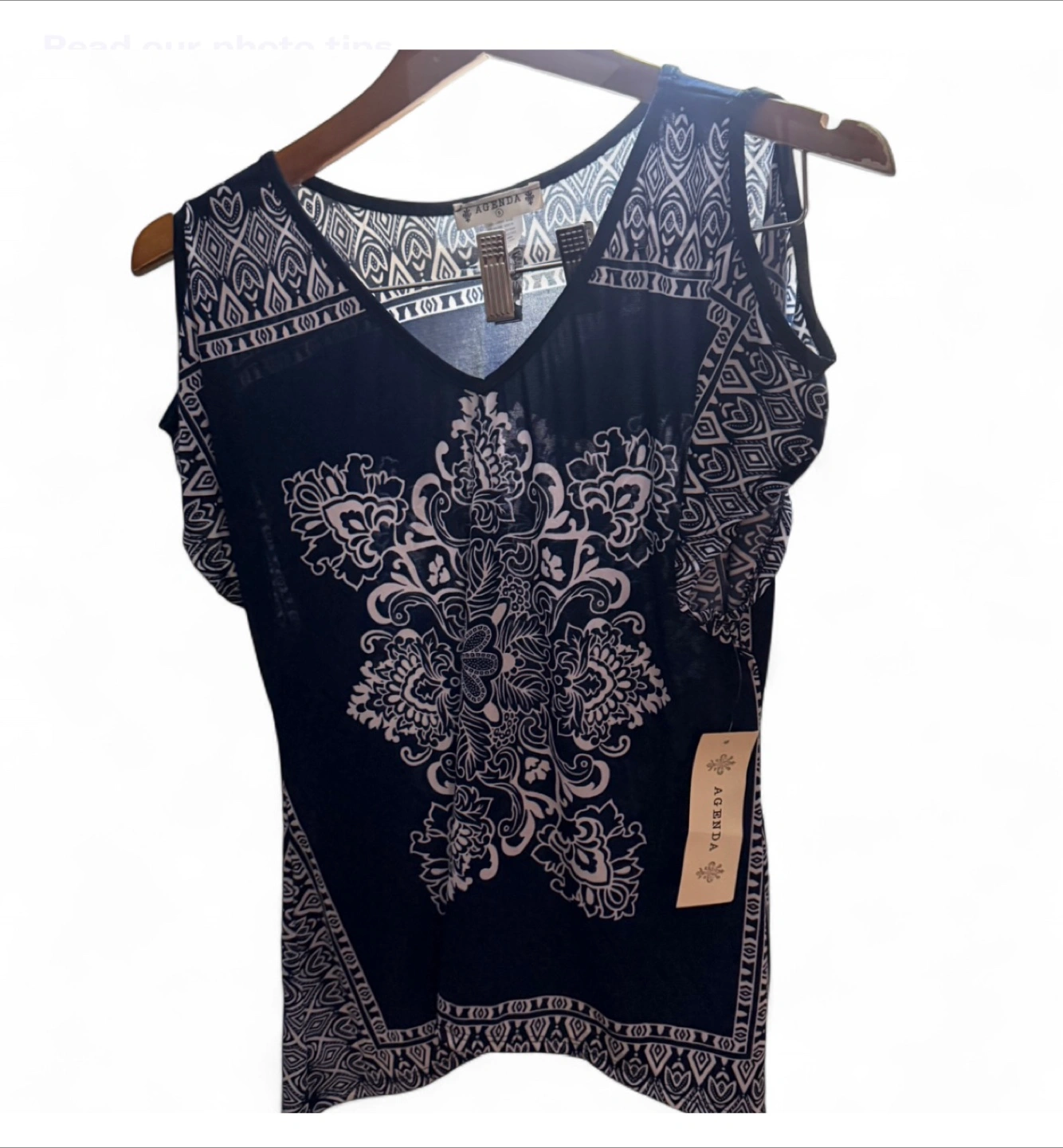 This is an Agenda black and white V-neck top. It features a unique pattern and a comfortable fit. Perfect for casual wear!