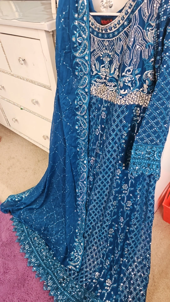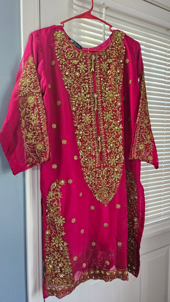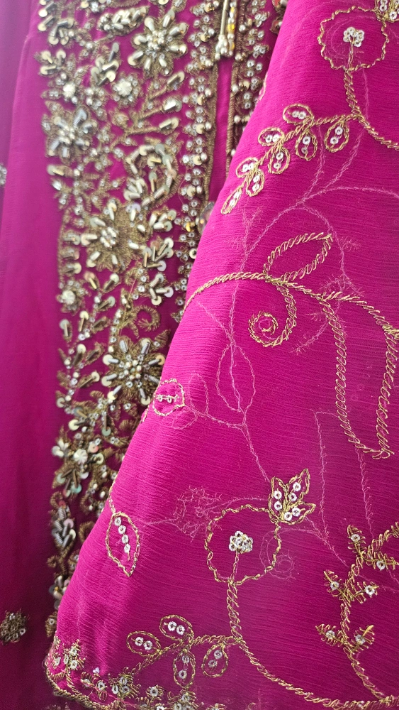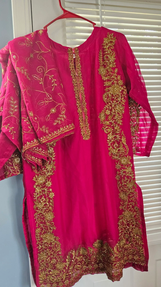 Beautiful designer salwar kameez suit from Agra Noor. Features intricate gold embellishments on a vibrant pink fabric. Perfect for special occasions!