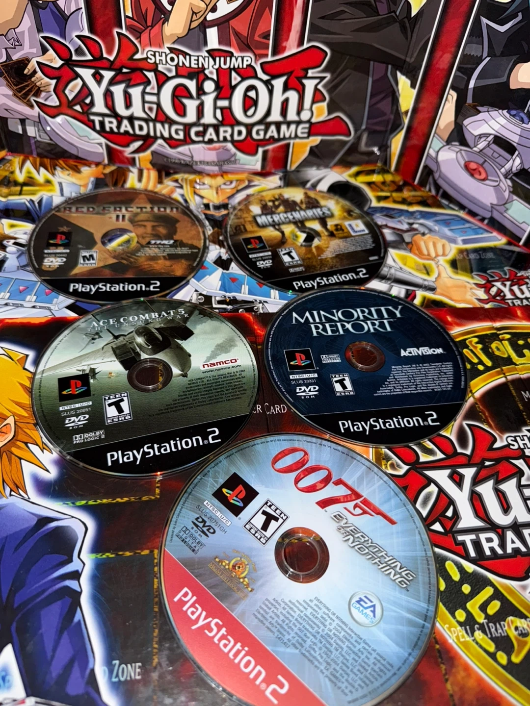 Lot of five PlayStation 2 video games including Red Faction, Mercenaries, Minority Report, Ace Combat 5: The Unsung War, and 007: Everything or Nothing. All discs are for PlayStation 2.
