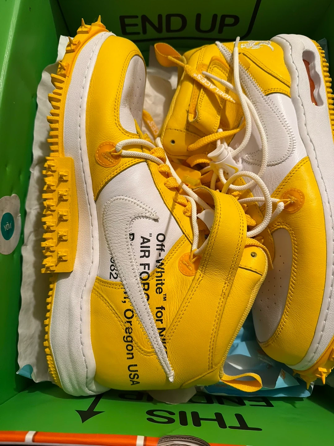 Off-White for Nike Air Force 1 sneakers in yellow and white. Made in Oregon, USA. These shoes have unique spiky soles and "OFF-WHITE" branding on the laces and side. Includes original box and packaging. This is a size 14