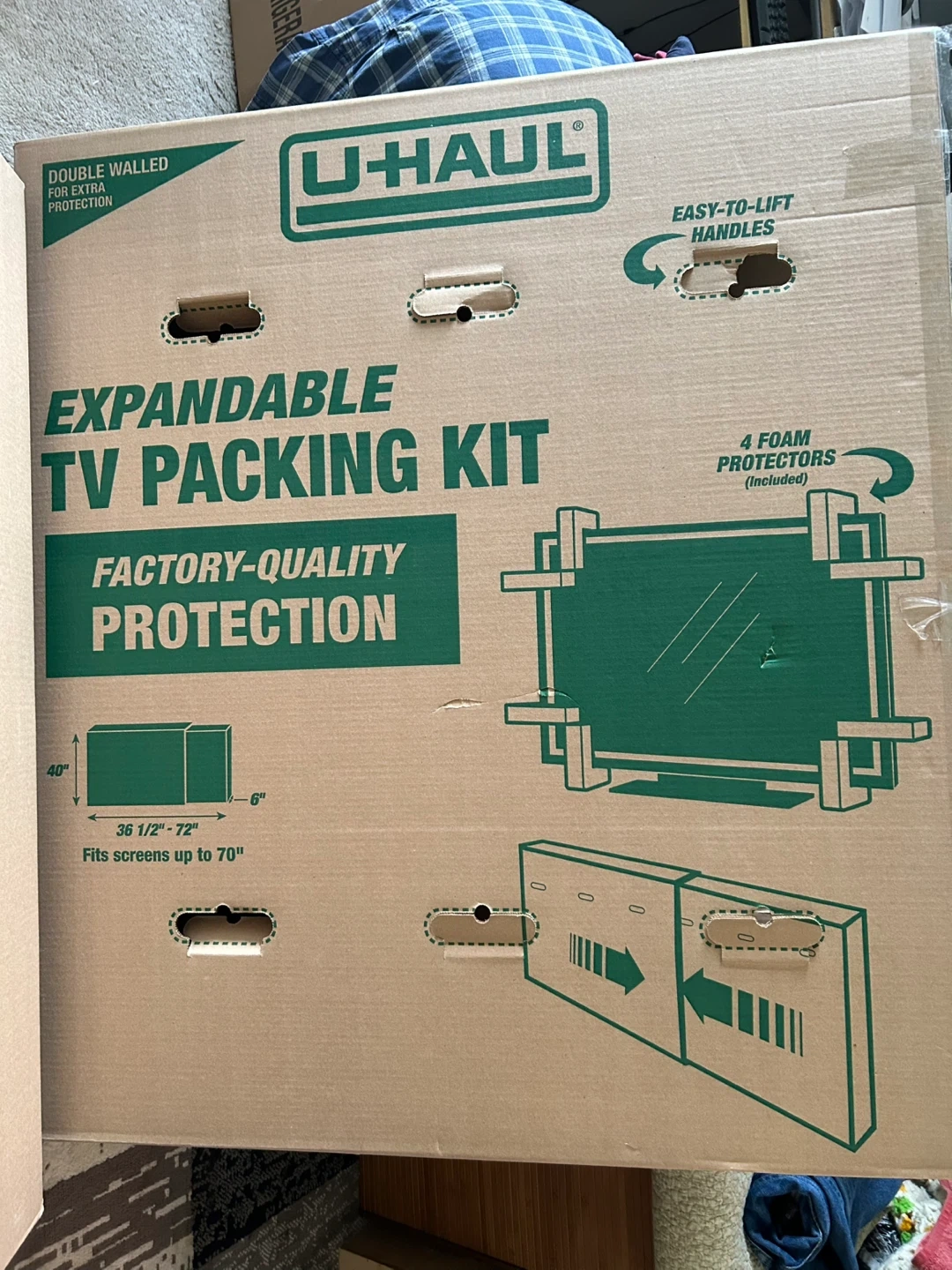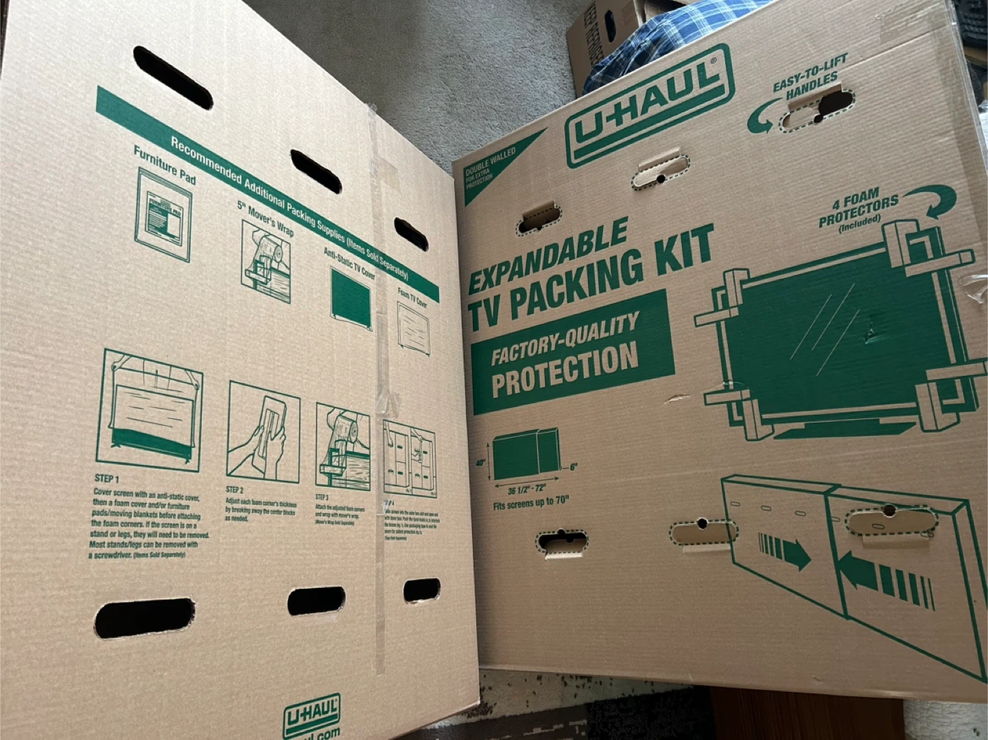 U-Haul expandable TV packing kit for screens up to 70 inches. Fits screens from 36 1/2" to 72" long, 6" to 40" high, and 6" deep. Includes 3 foam protectors for added safety. Double-walled for extra protection. Retails for $30.