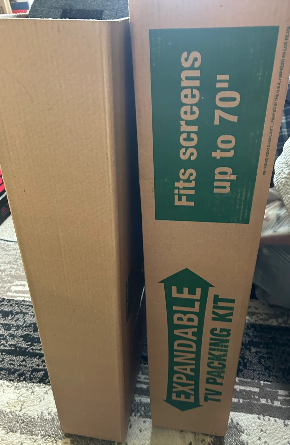 U-Haul expandable TV packing kit for screens up to 70 inches. Fits screens from 36 1/2" to 72" long, 6" to 40" high, and 6" deep. Includes 3 foam protectors for added safety. Double-walled for extra protection. Retails for $30.