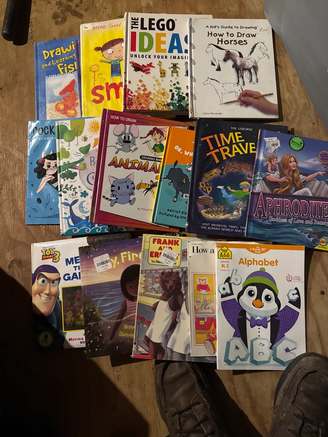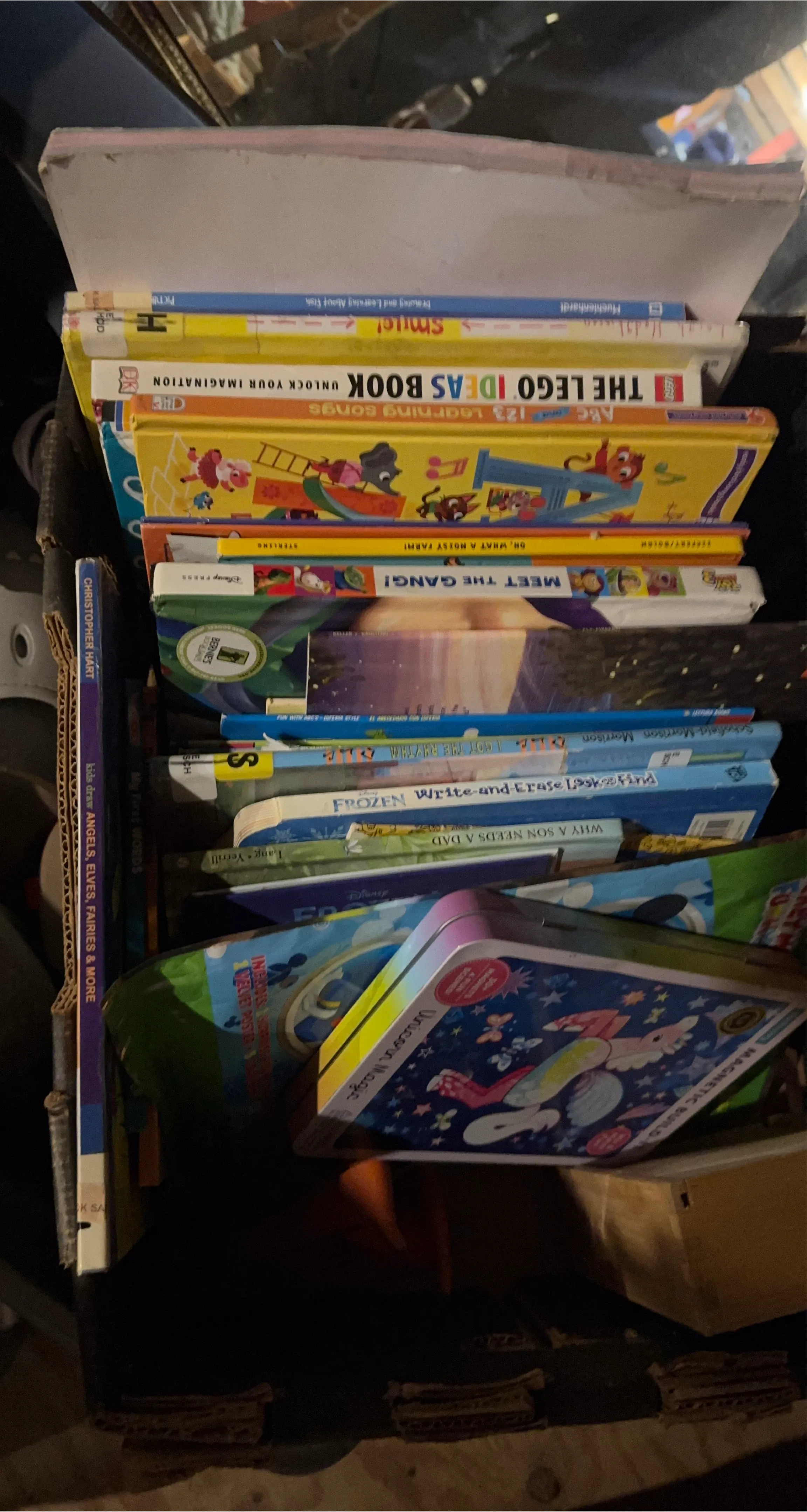 Bundle of various children's books (36 books)including activity books and storybooks. Titles include 'The Lego Ideas Book', 'Frozen: Write and Erase', and 'Aphrodite'. Great for young readers and creative minds!