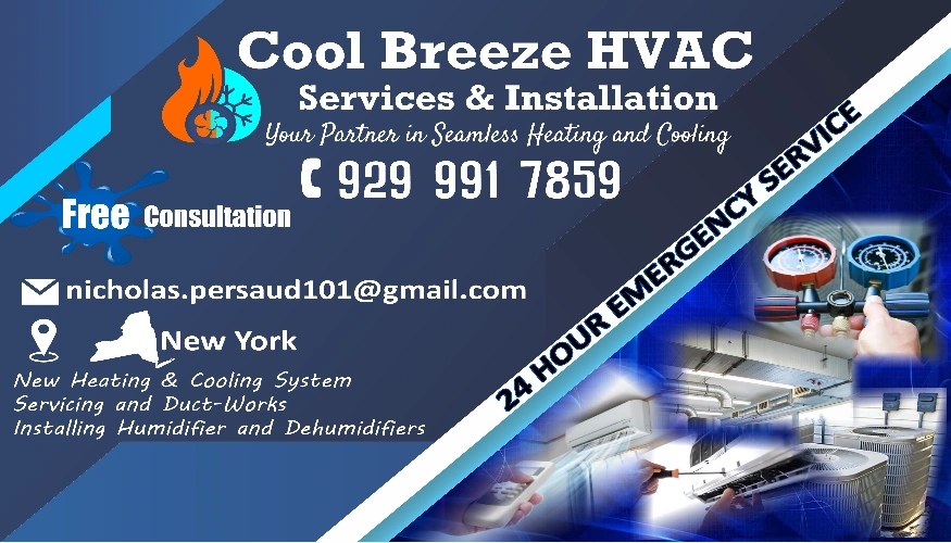 84Stay comfortable all year round with Cool Breeze HVAC Services & Installation β your trusted partner in seamless heating, cooling, and ventilation across New York. We specialize in: π₯ Heating & Boilers β Installation, service, and repair of gas and hot water boilers βοΈ Cooling Systems β Central air, mini splits, and rooftop units π¨ Ductwork & Airflow β Custom duct installations and clean-ups π§ Humidity Control β Humidifier and dehumidifier installation π§° Maintenance & Repairs β Full system checkups and diagnostics β Free Consultation β 24-Hour Emergency Service β Licensed & Experienced Technicians Whether itβs a new system installation or an urgent repair, Cool Breeze HVAC delivers quality, reliability, and comfort when you need it most. π Call or text 929-991-7859 π§ Email: nicholas.persaud101@gmail.com π Serving all of New York