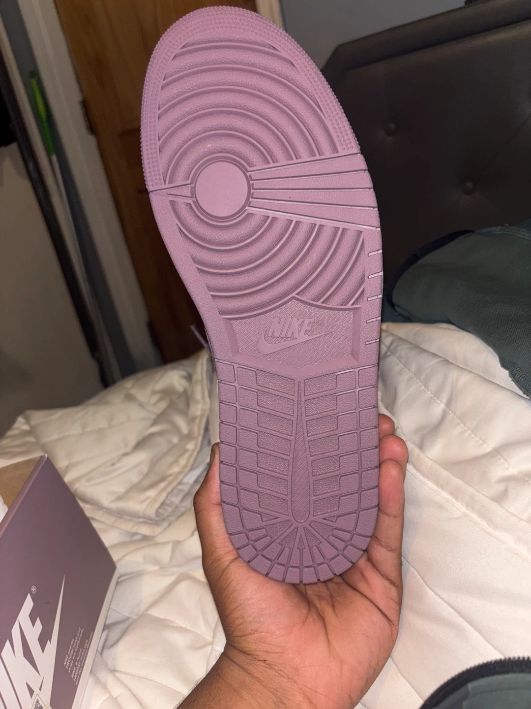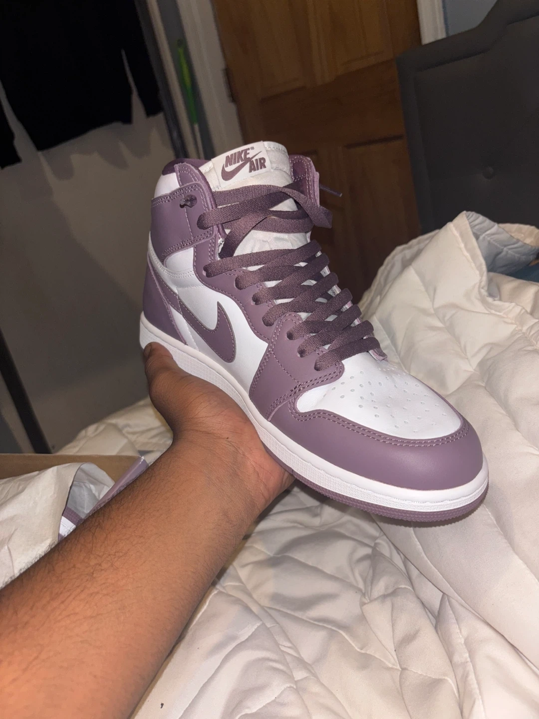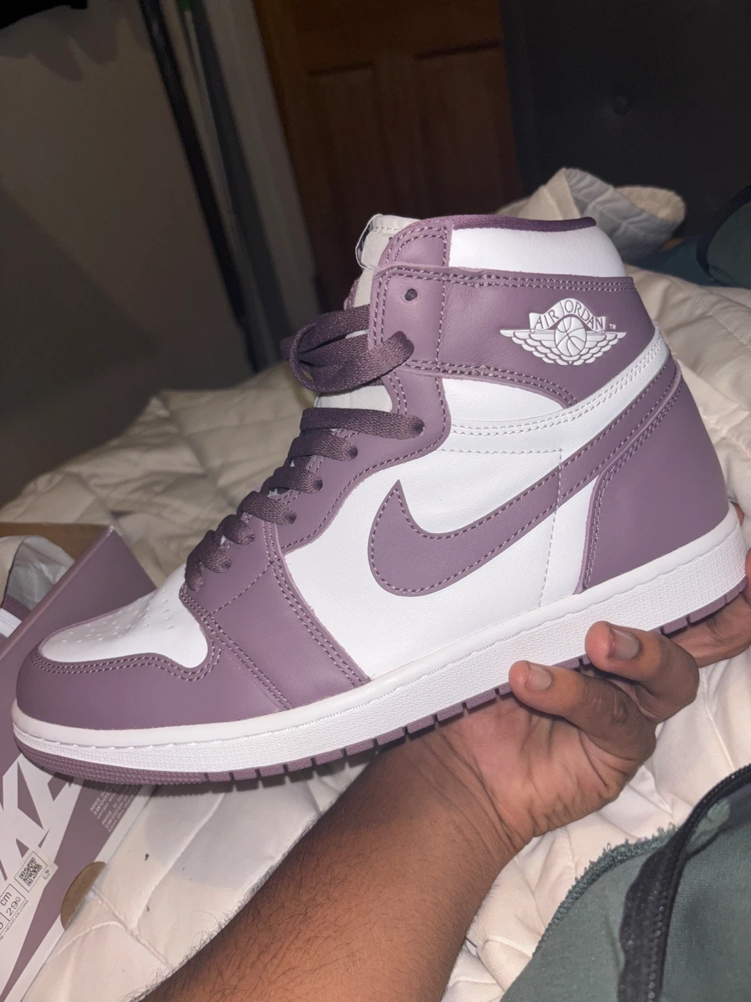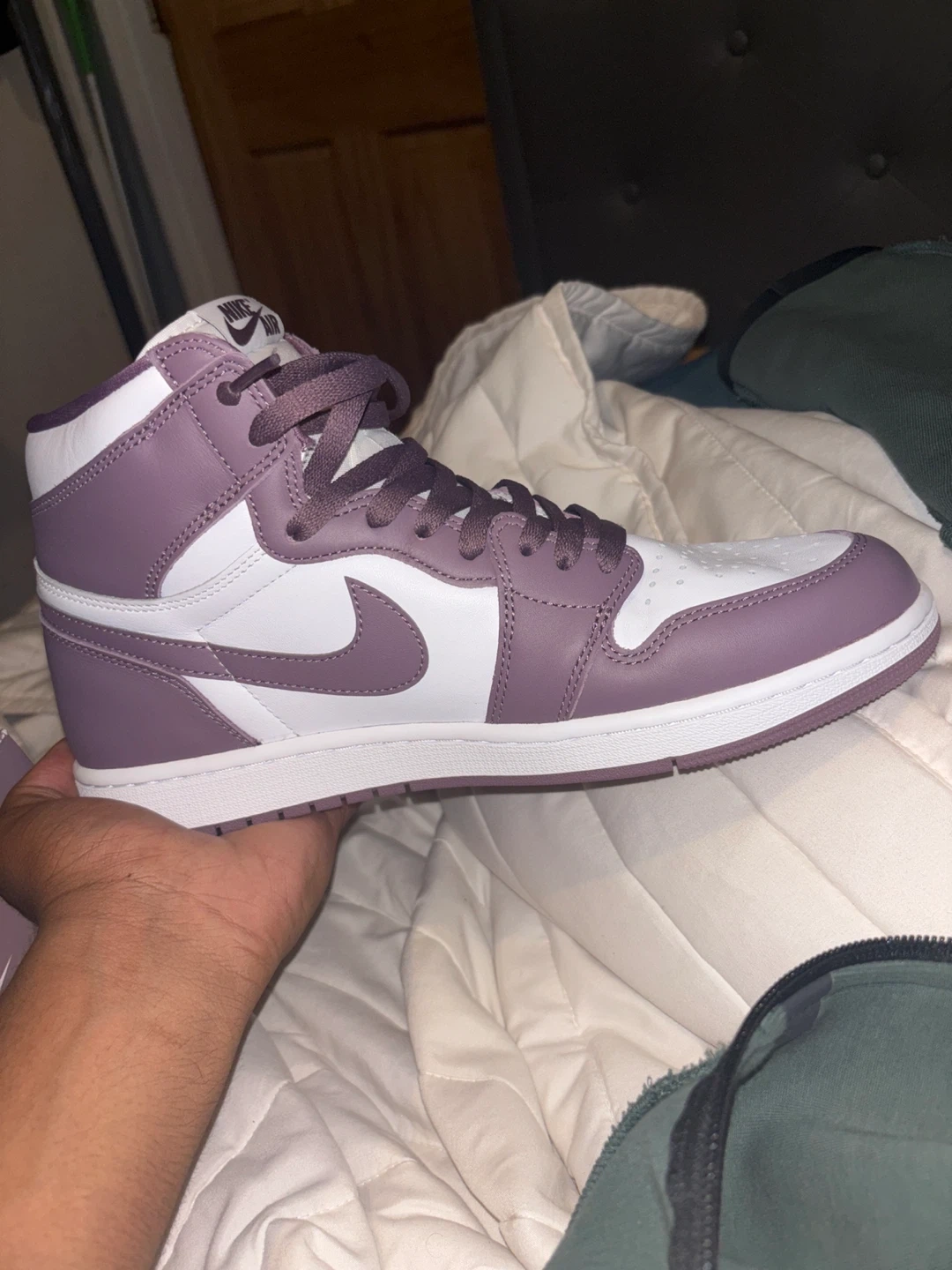 Selling a pair of Air Jordan 1 High sneakers in a white and purple colorway. They are in great condition!