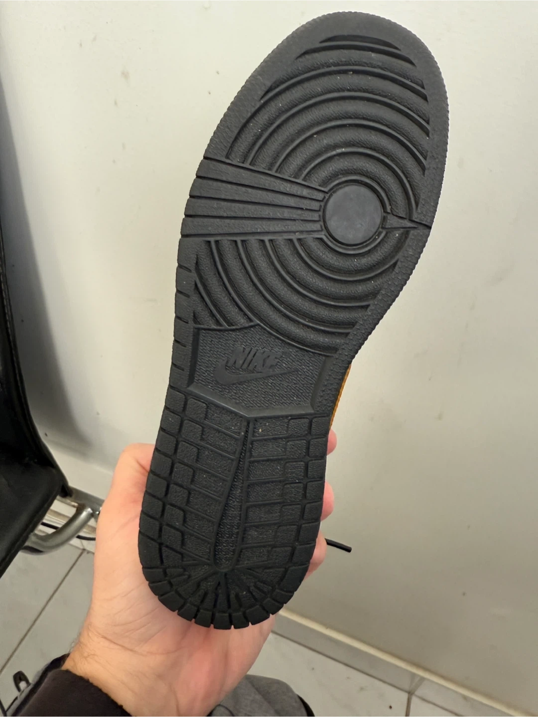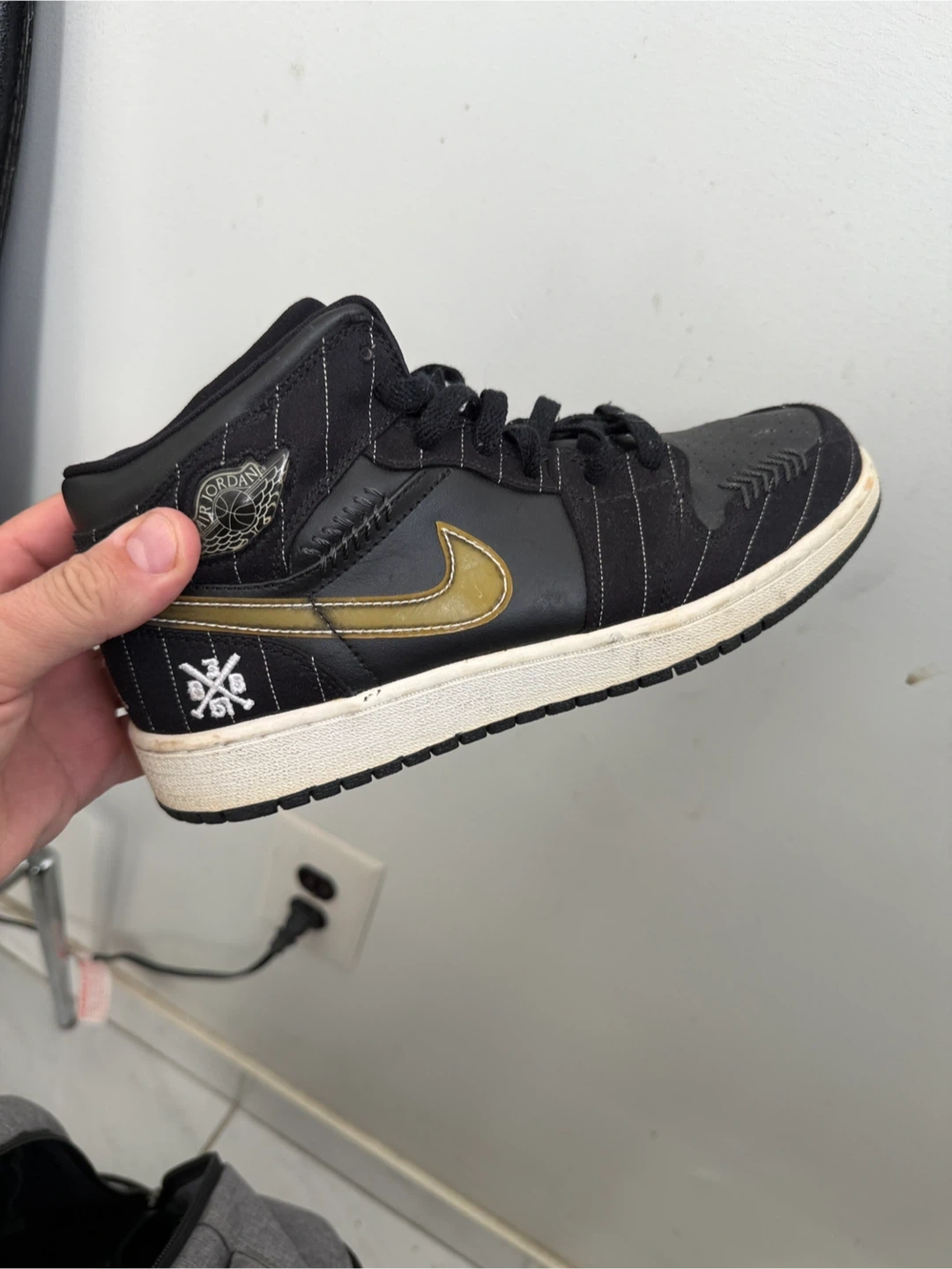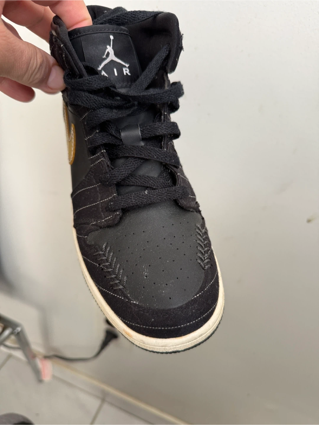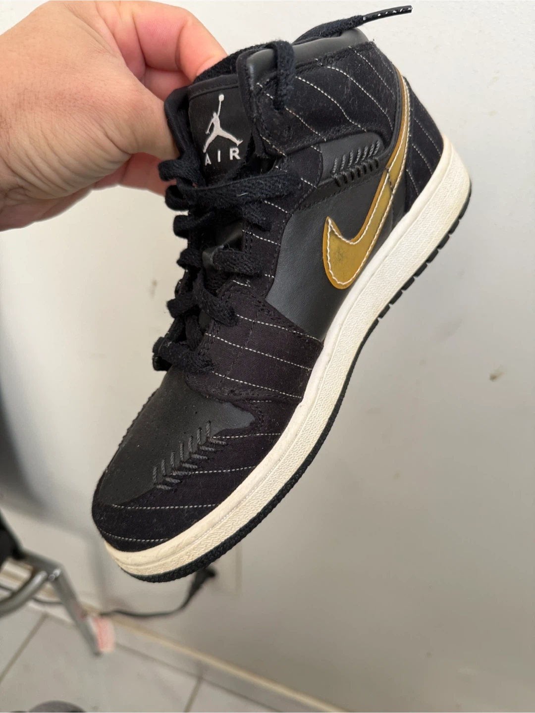 Selling a pair of Air Jordan 1 Mid sneakers in black and gold. They show some signs of wear, as you can see in the photos, but still have plenty of life left! Perfect for casual wear or hitting the court