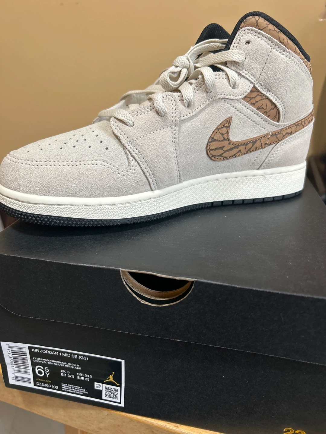 Selling a pair of Air Jordan 1 Mid SE (GS) in size 6.5Y. Never worn and in new condition. The color is Lt Orewood Brn/Metallic Gold. Comes with the original box!