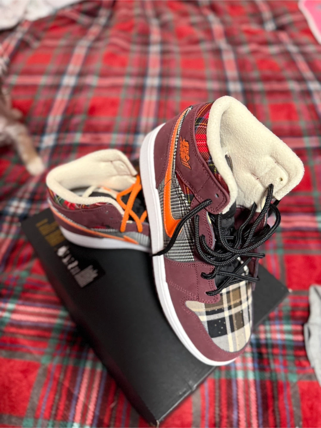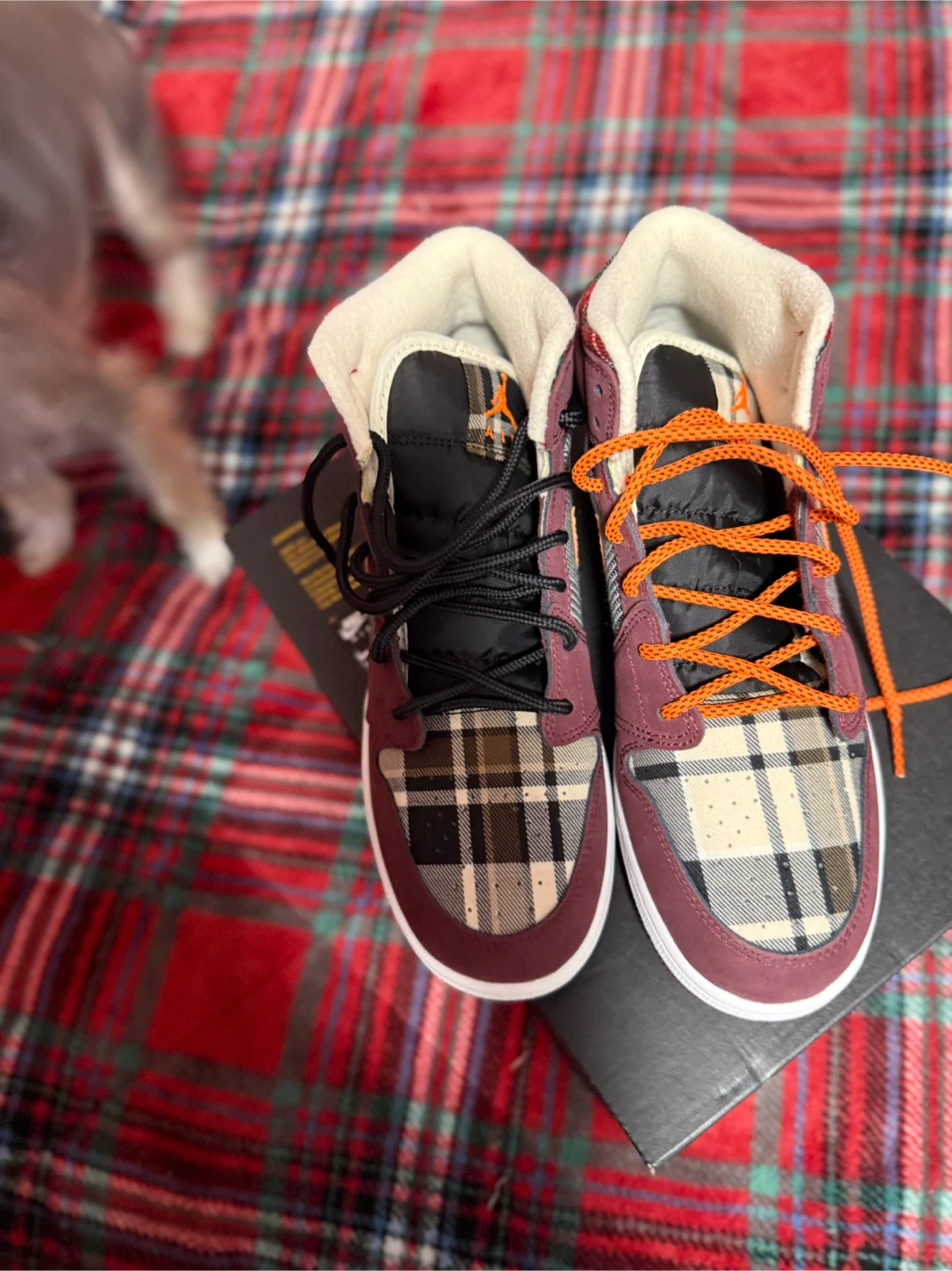5Selling a pair of Air Jordan 1 Mid SE shoes with a unique tartan plaid design. These shoes are in great condition and come with the original box. The design incorporates a mix of colors and textures, making them a stylish addition to any wardrobe. Feel free to ask any questions!