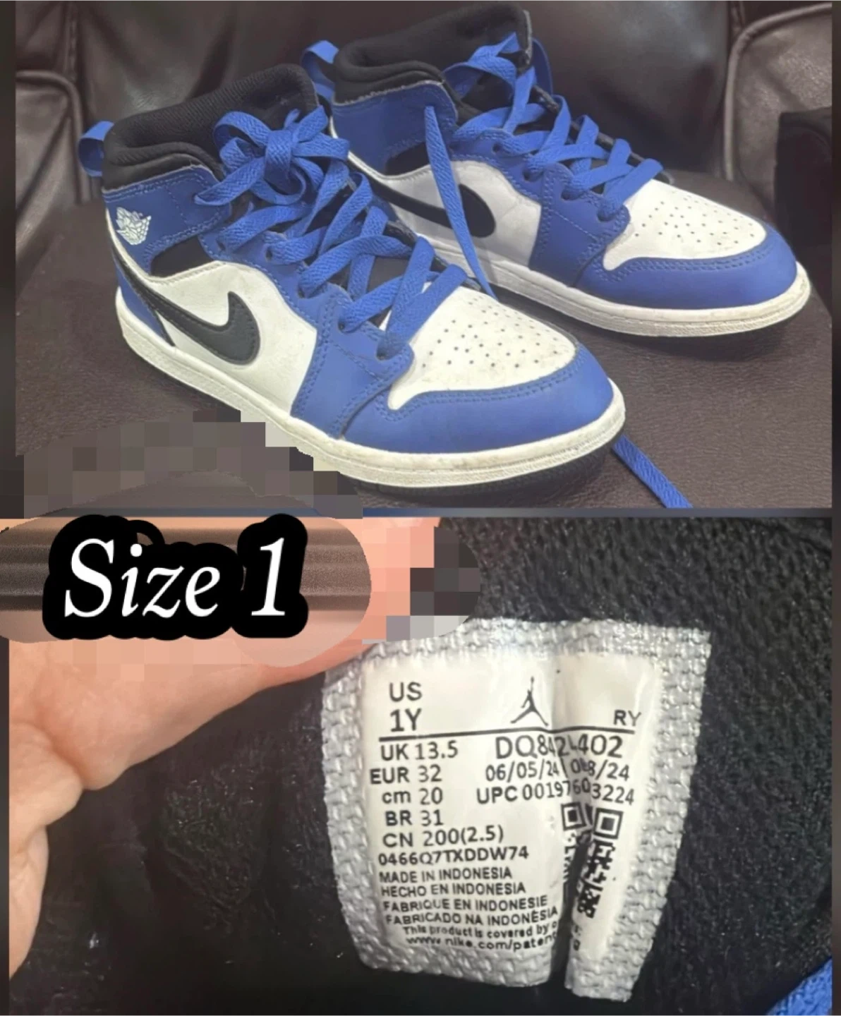Selling a pair of Air Jordan 1 Mid sneakers in a youth size 1 The shoes feature a stylish blue and white.