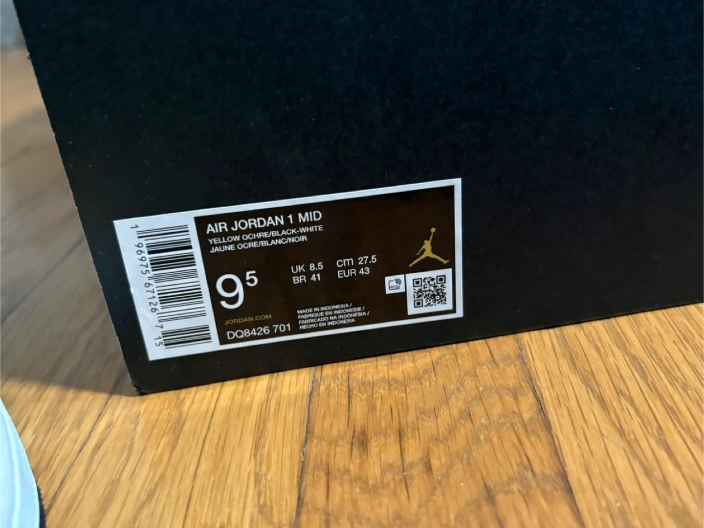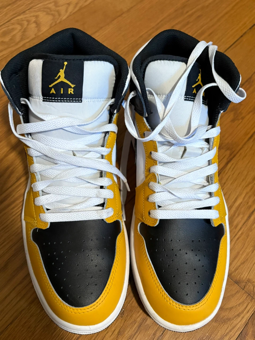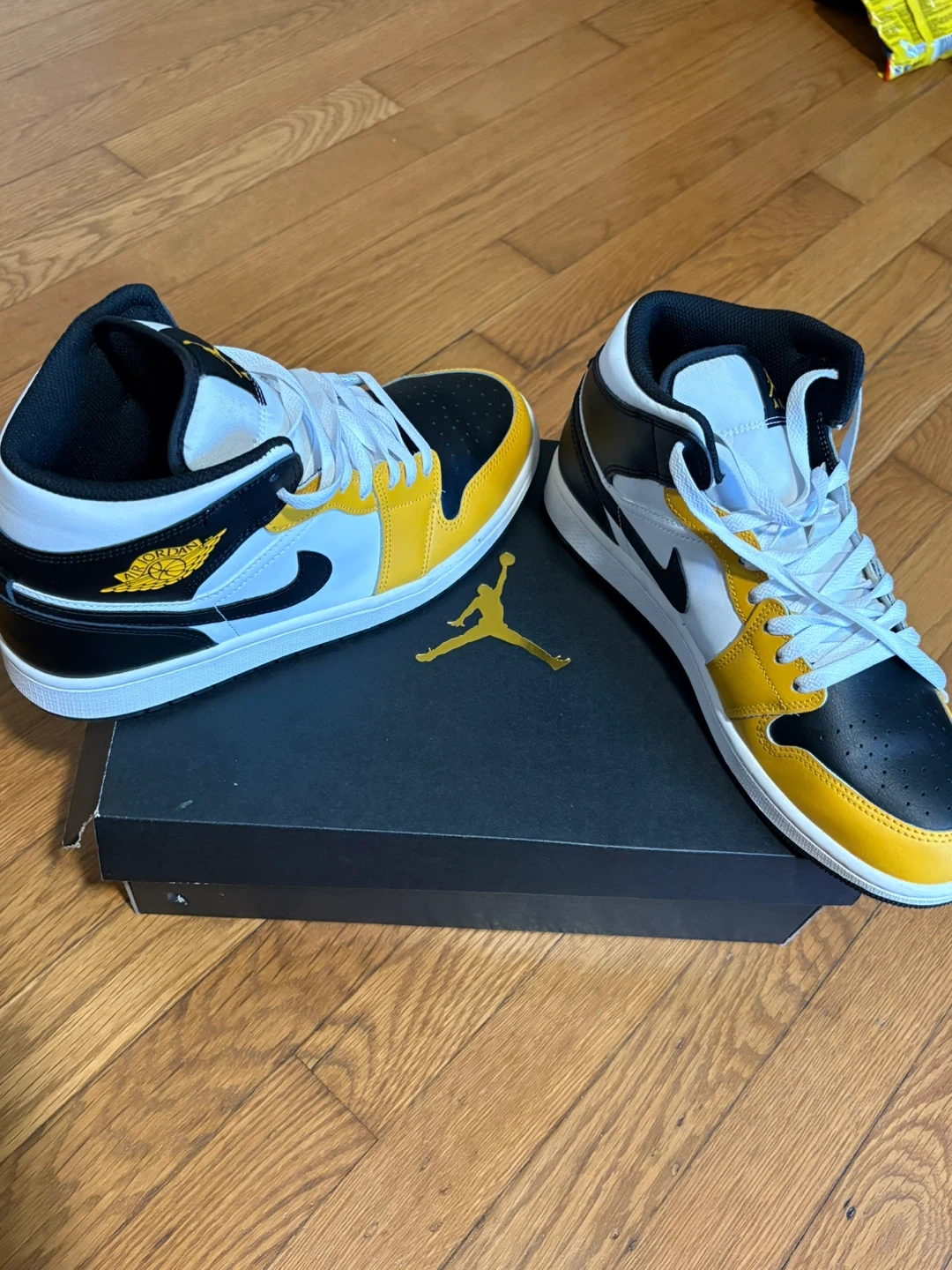 24Selling a pair of Air Jordan 1 Mid sneakers in the Yellow Ochre/Black-White colorway. These are a US size 9.5. Comes with the original box!