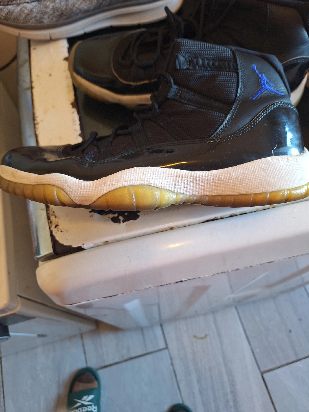 60Selling a pair of Air Jordan 11 Retro sneakers. They are black with royal blue accents and a white sole. They show signs of wear.