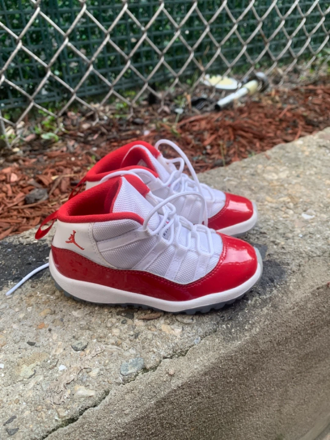 Selling a pair of Air Jordan 11 Retro Little Flex (TD) toddler shoes in size 5. These are red and white and in good condition!