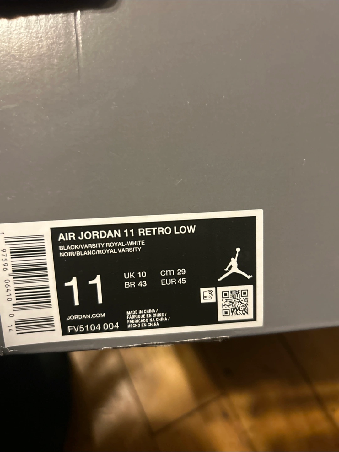 25Not negotiable . Price firm. Selling a pair of Air Jordan 11 Retro Low sneakers in black and varsity royal! They are in used condition, as you can see from the soles. Size 11. Comes with the original box