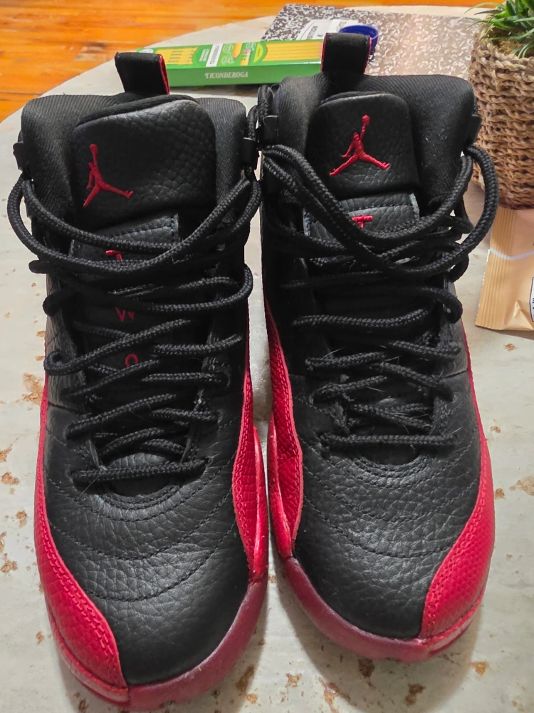 Selling a pair of Air Jordan 12 Retro sneakers in black and red. Size is 6Y. They are in good condition and ready for a new home!