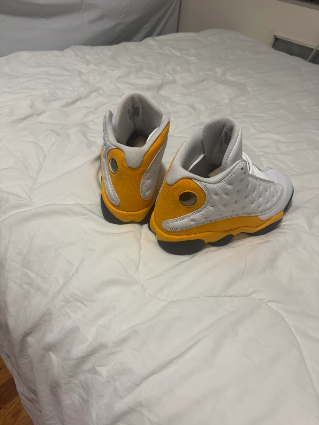 60Selling a pair of Air Jordan 13 Retro sneakers in white and yellow. They are a size 9.5 and in good condition, perfect for everyday wear or adding to your collection! The iconic Jumpman logo is featured on the side.