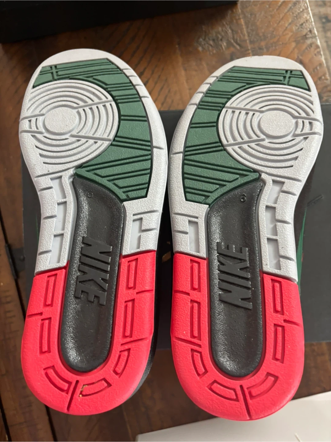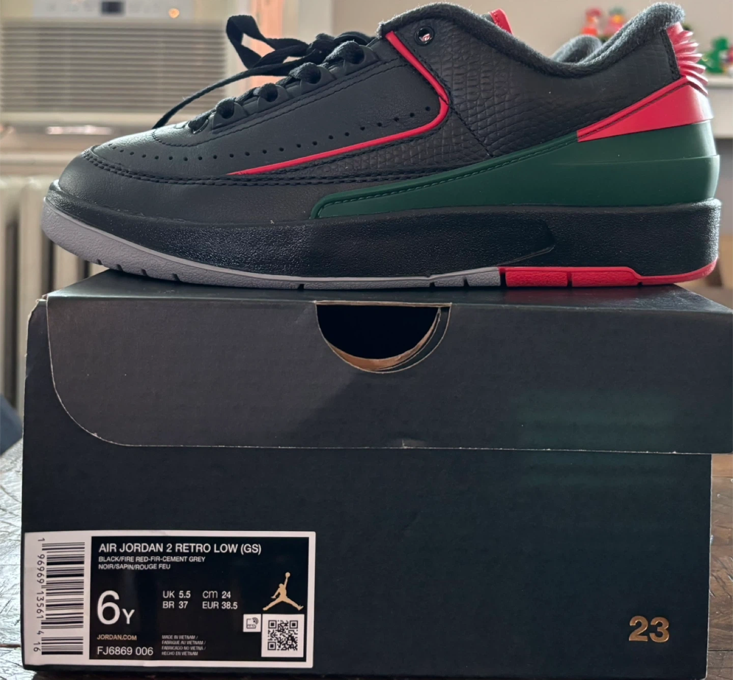 10Selling a pair of Air Jordan 2 Retro Low (GS) in black, red, and cement grey. These are a size 6Y. Worn once. The box is included!
