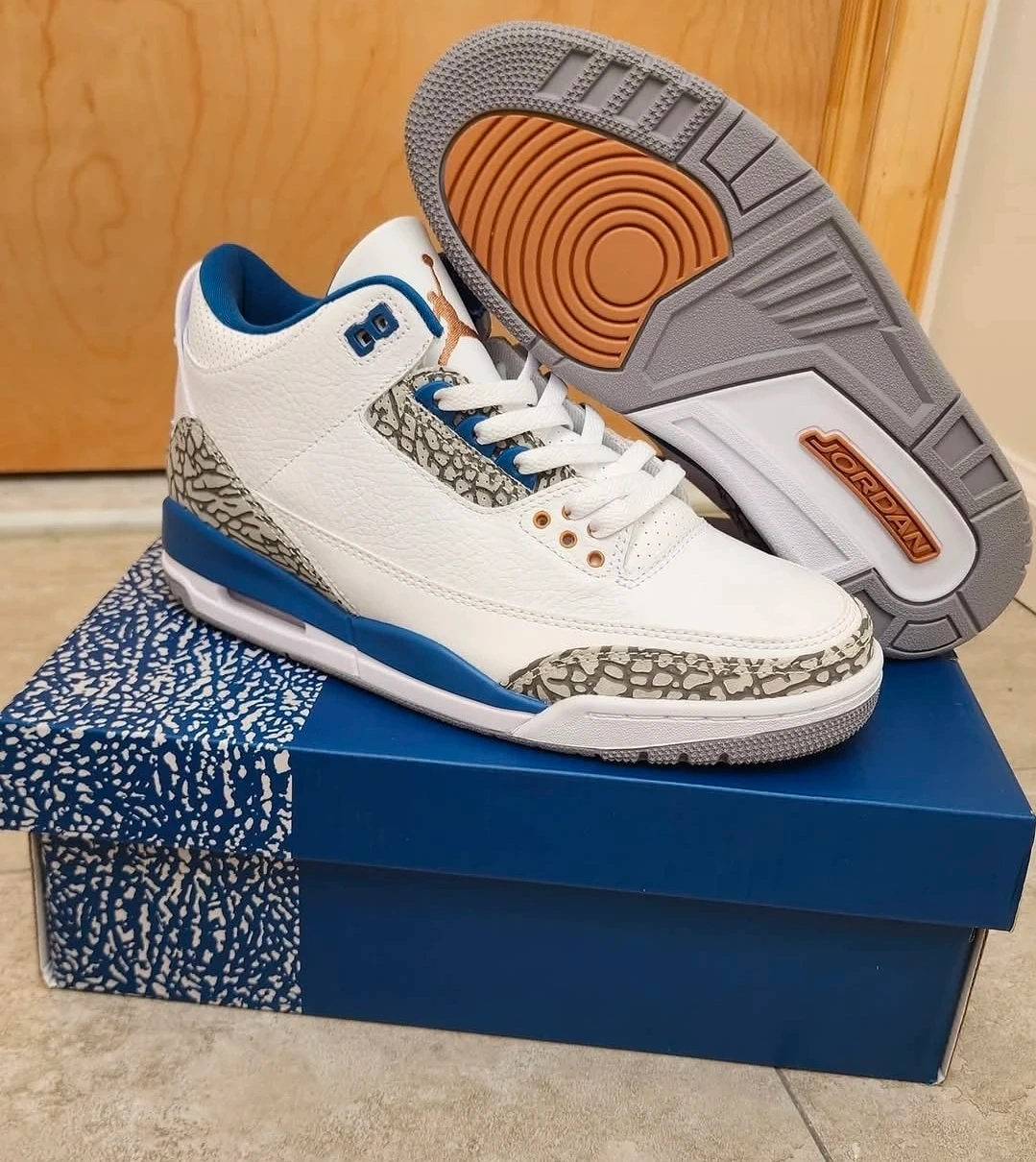 10Air Jordan 3 Retro size 7 These come with the original box! They feature a white leather upper with blue accents and the classic elephant print detailing.