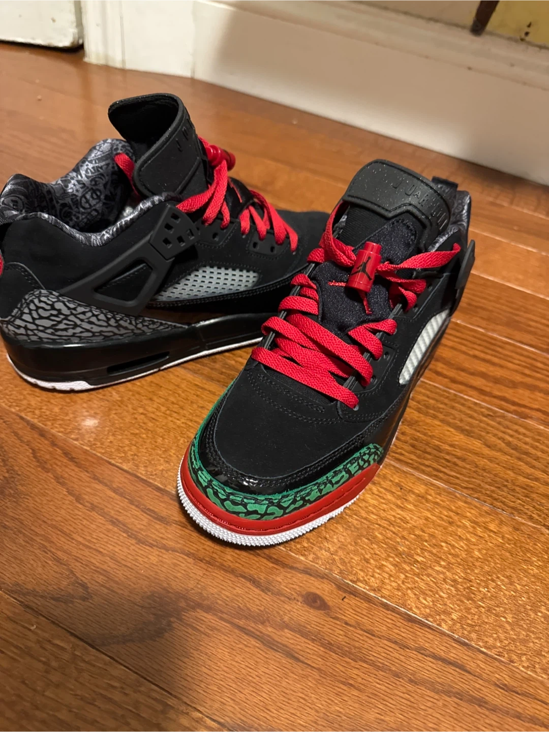 Selling a pair of Air Jordan 3 Retro SP sneakers in size 7Y. They feature a black, red, and green colorway. These are in great condition and ready for a new home!