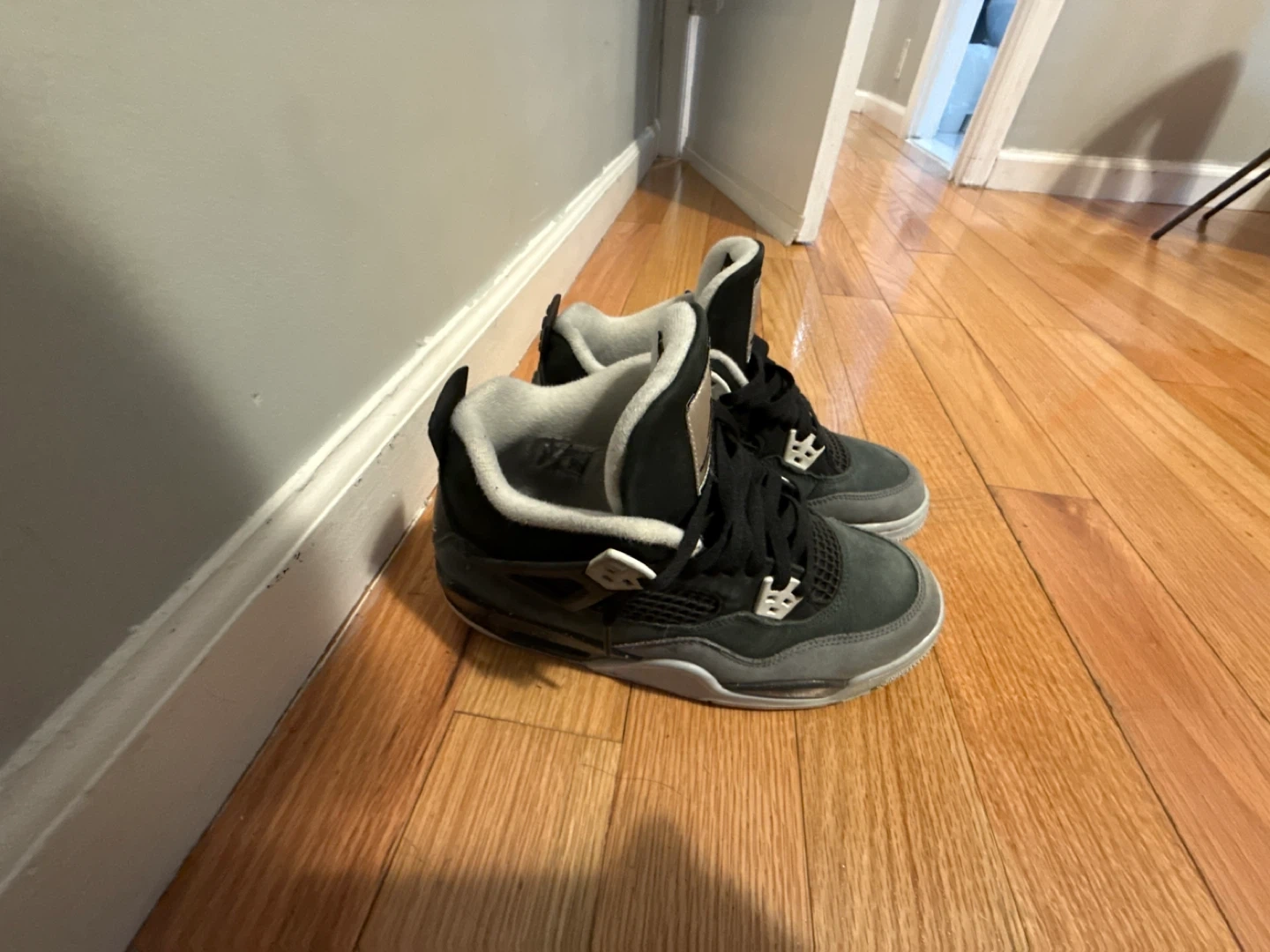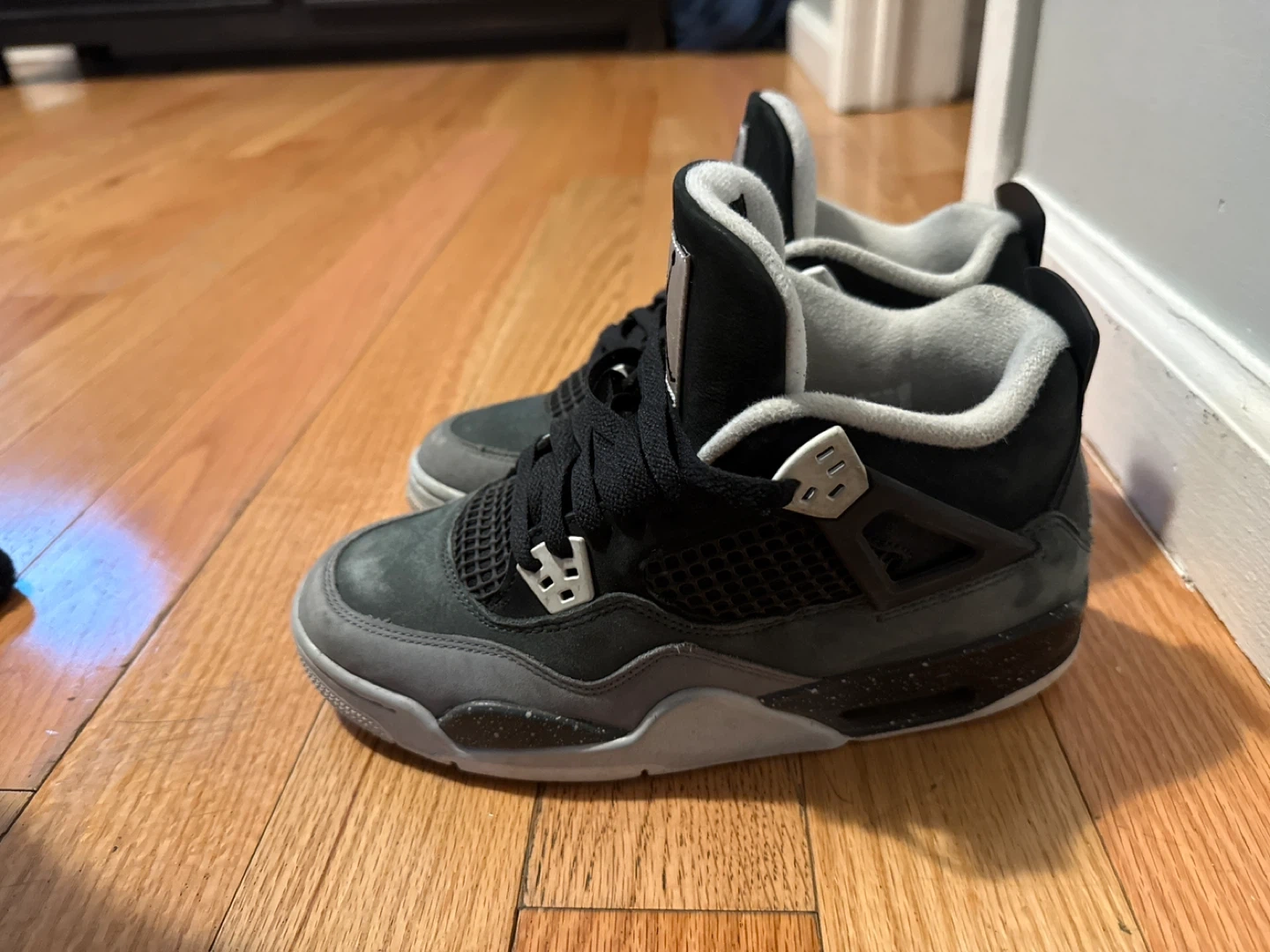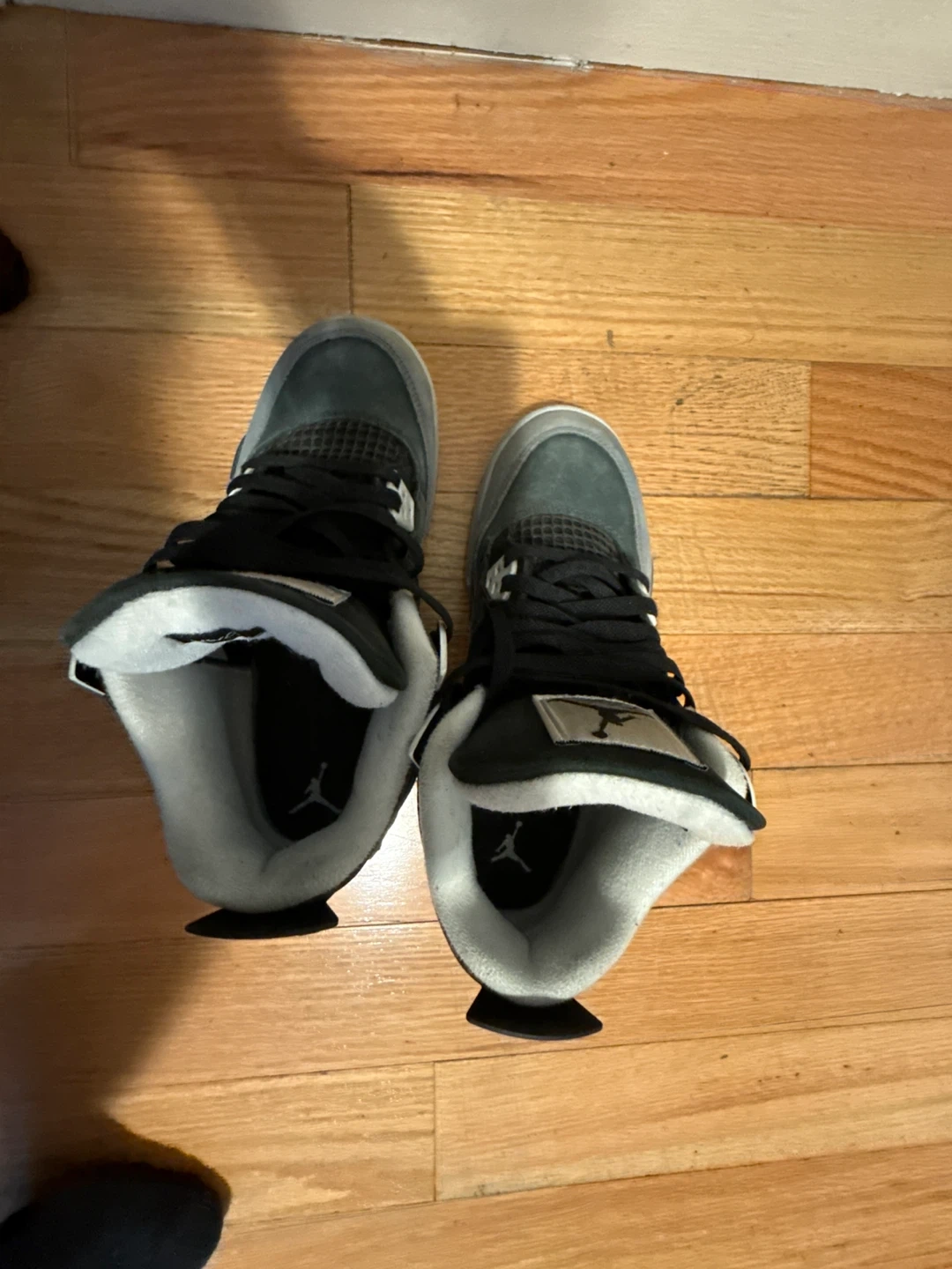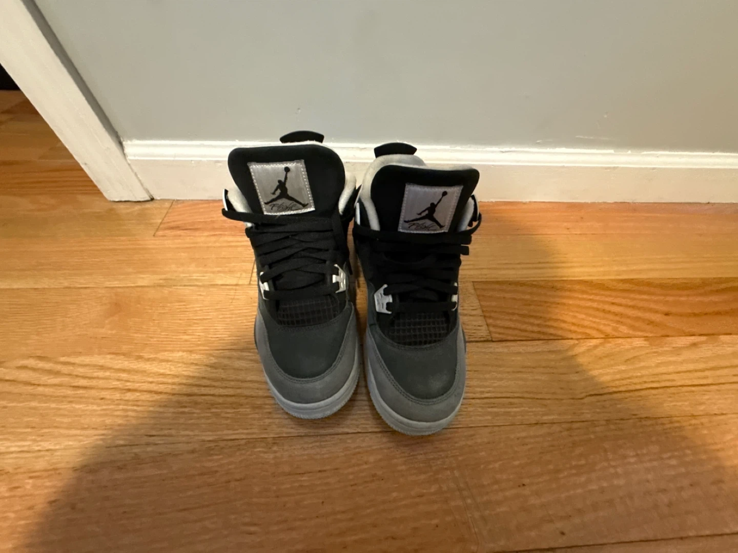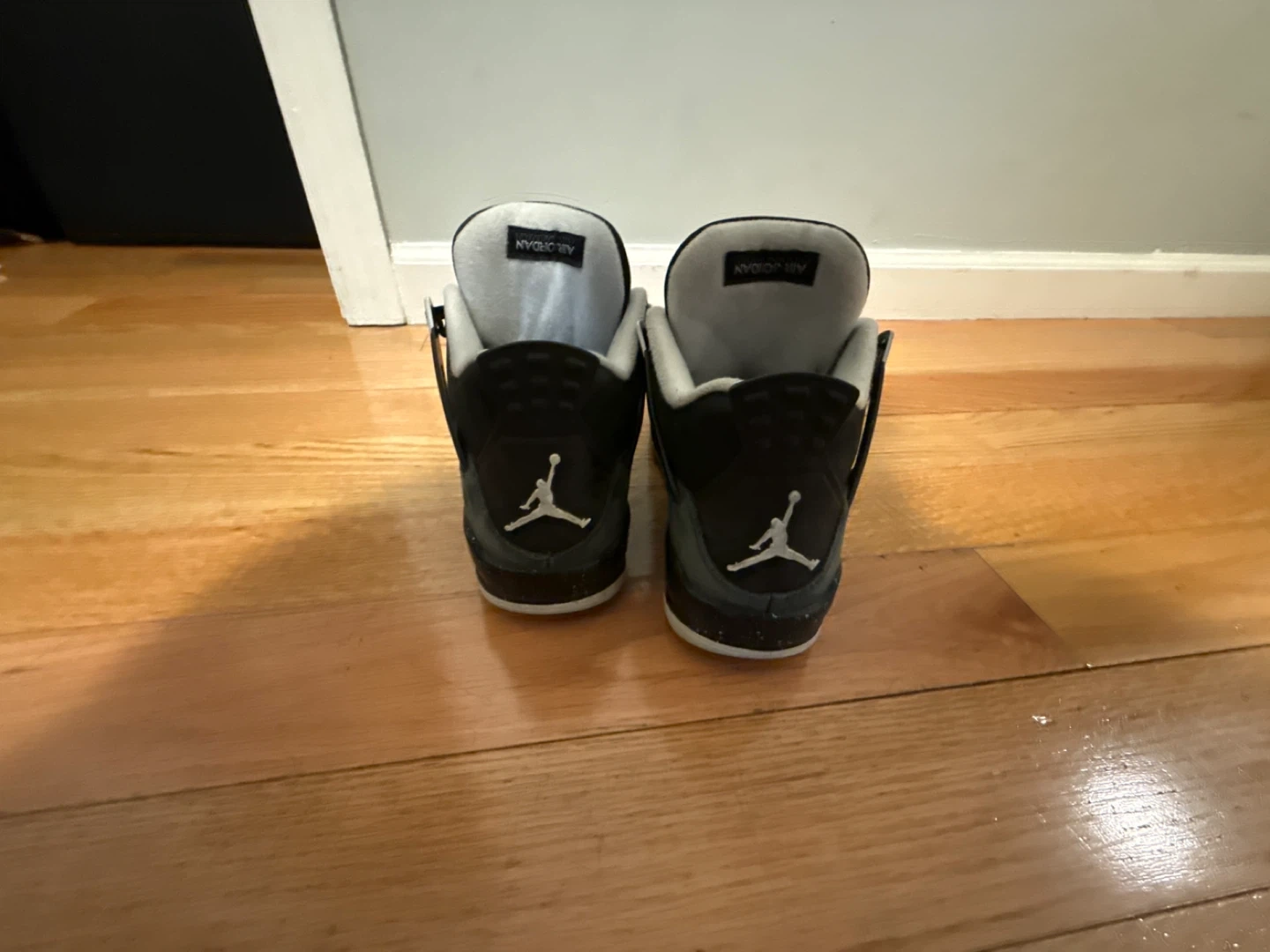 Selling a pair of Air Jordan 4 Retro sneakers in black and light steel grey. They're in good condition and ready for a new home!