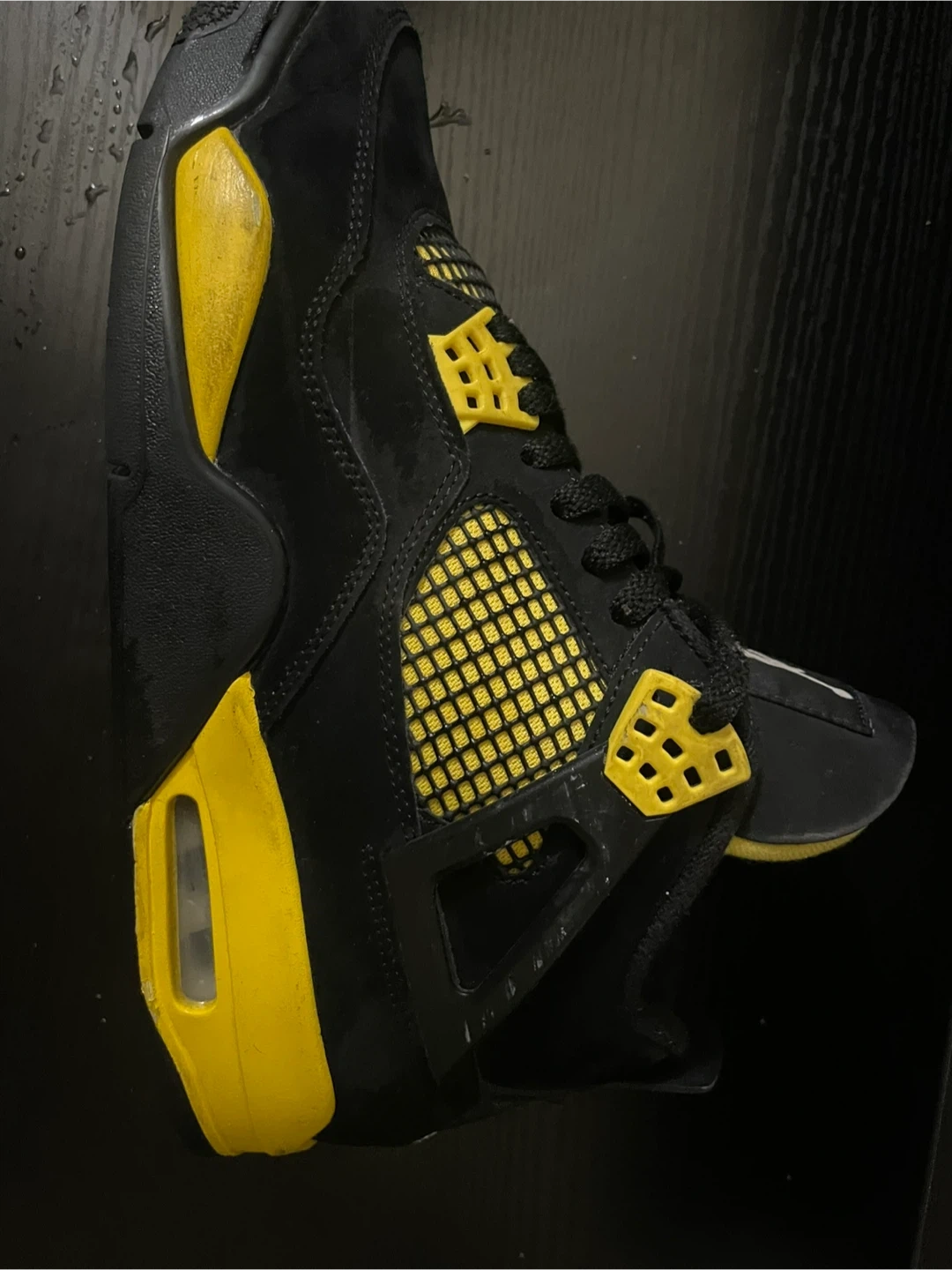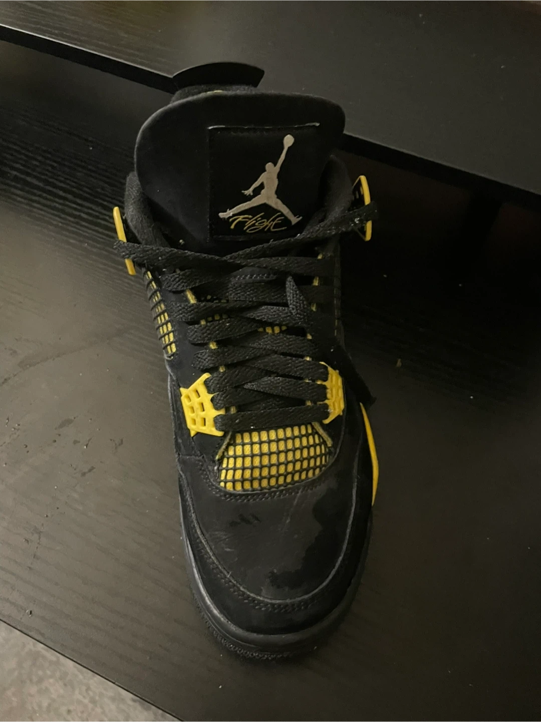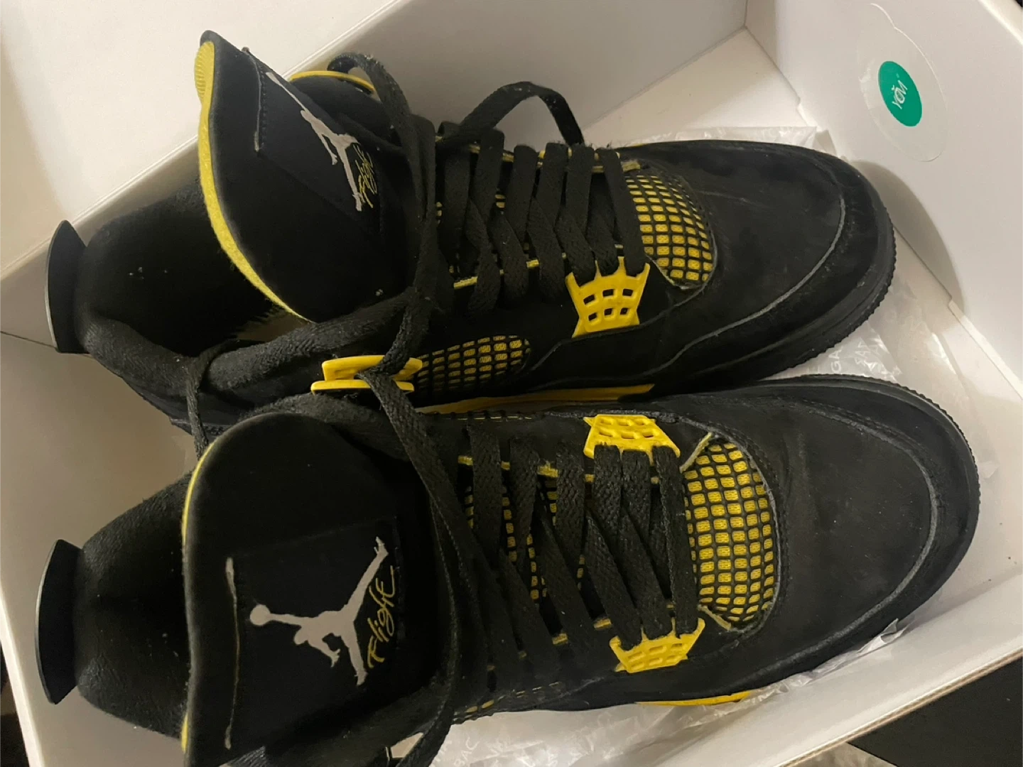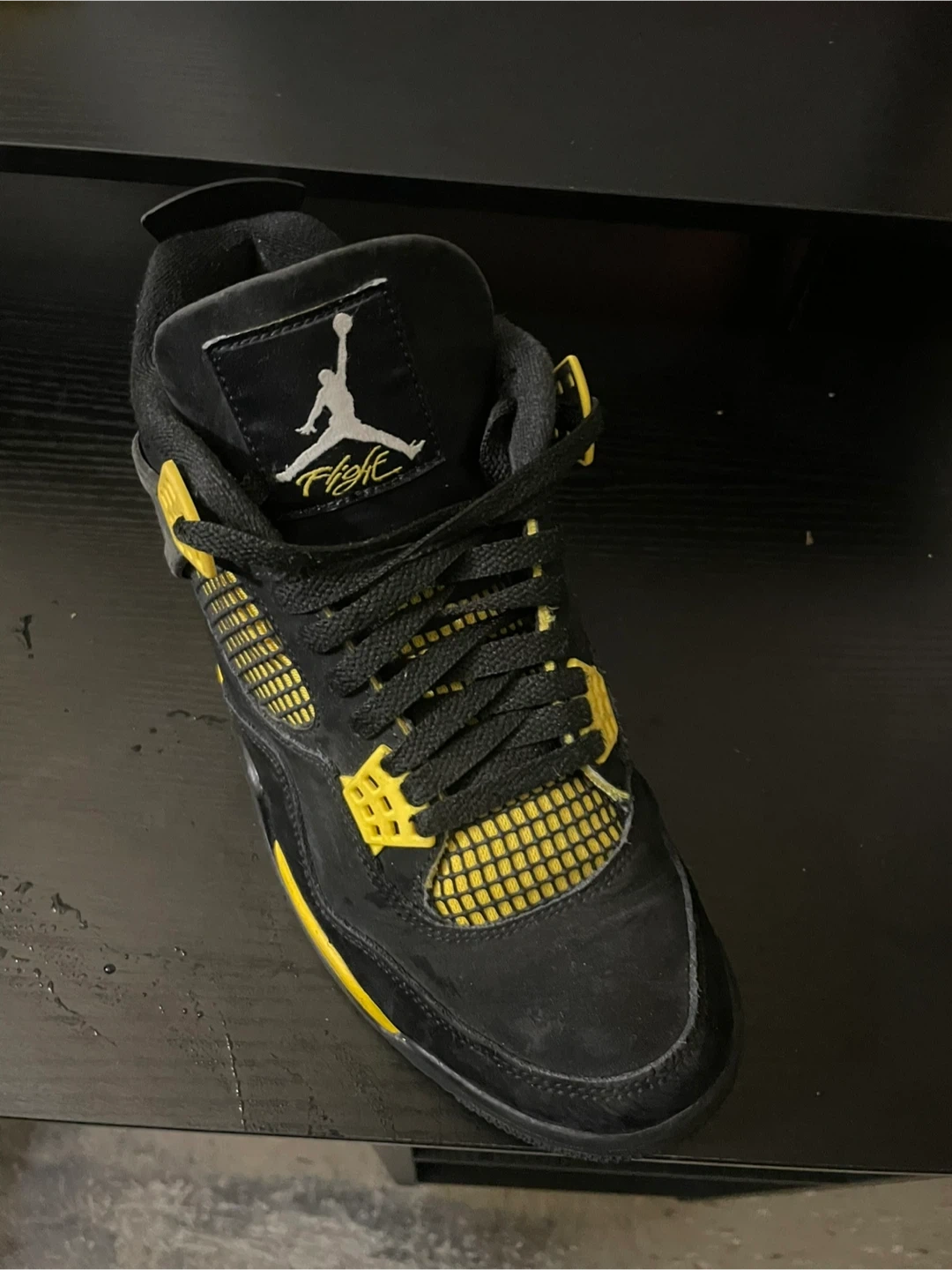 Selling a pair of Air Jordan 4 Retro in Black and Lightning colorway. These sneakers have a classic design and are in good condition. Perfect for adding a stylish touch to your wardrobe!