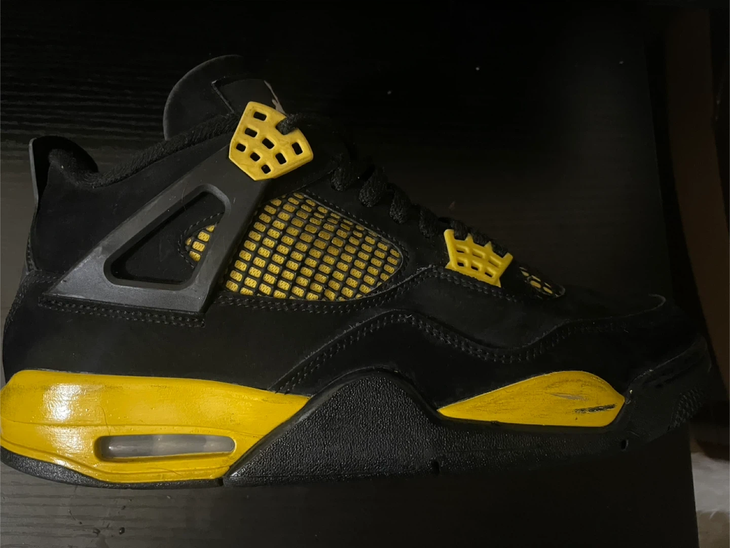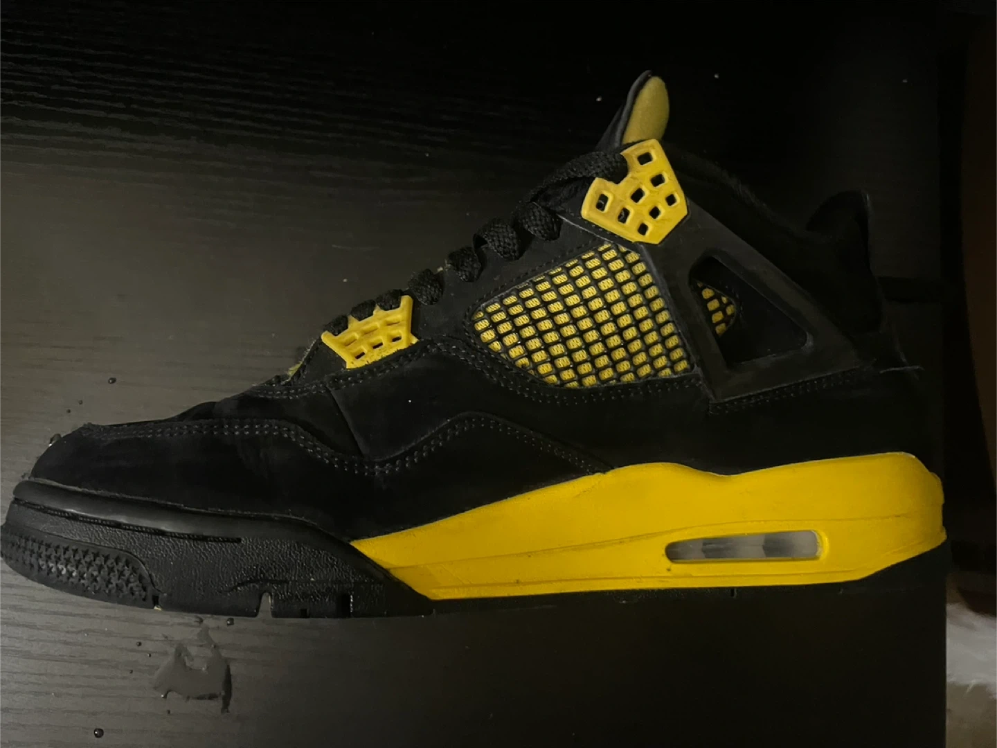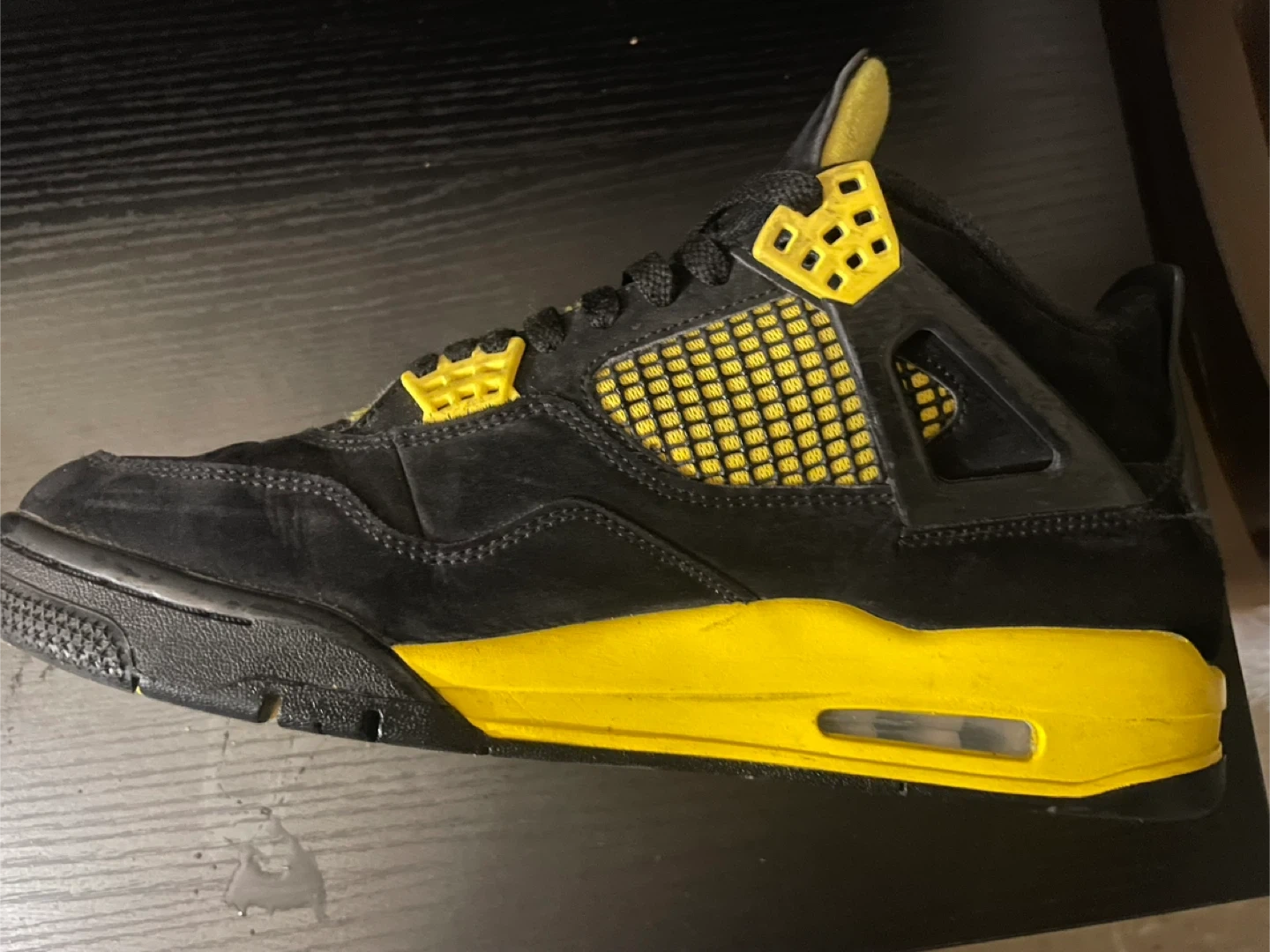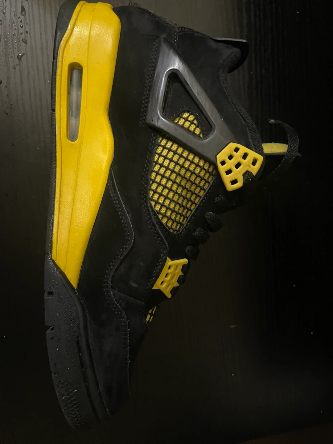 Selling a pair of Air Jordan 4 Retro in Black and Lightning colorway. These sneakers have a classic design and are in good condition. Perfect for adding a stylish touch to your wardrobe!