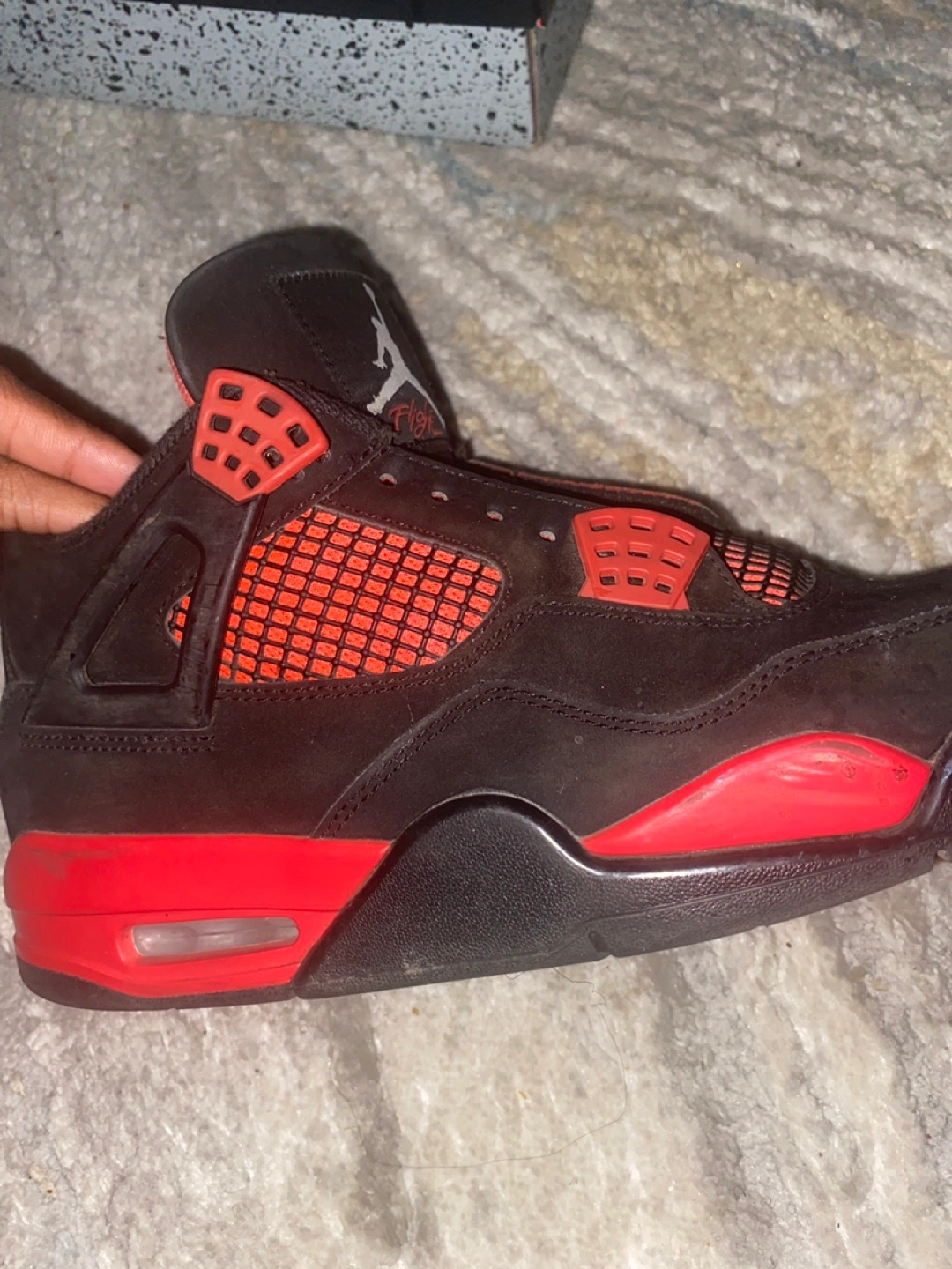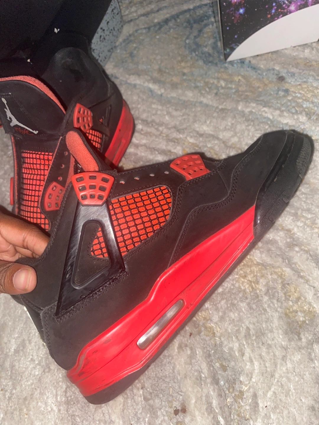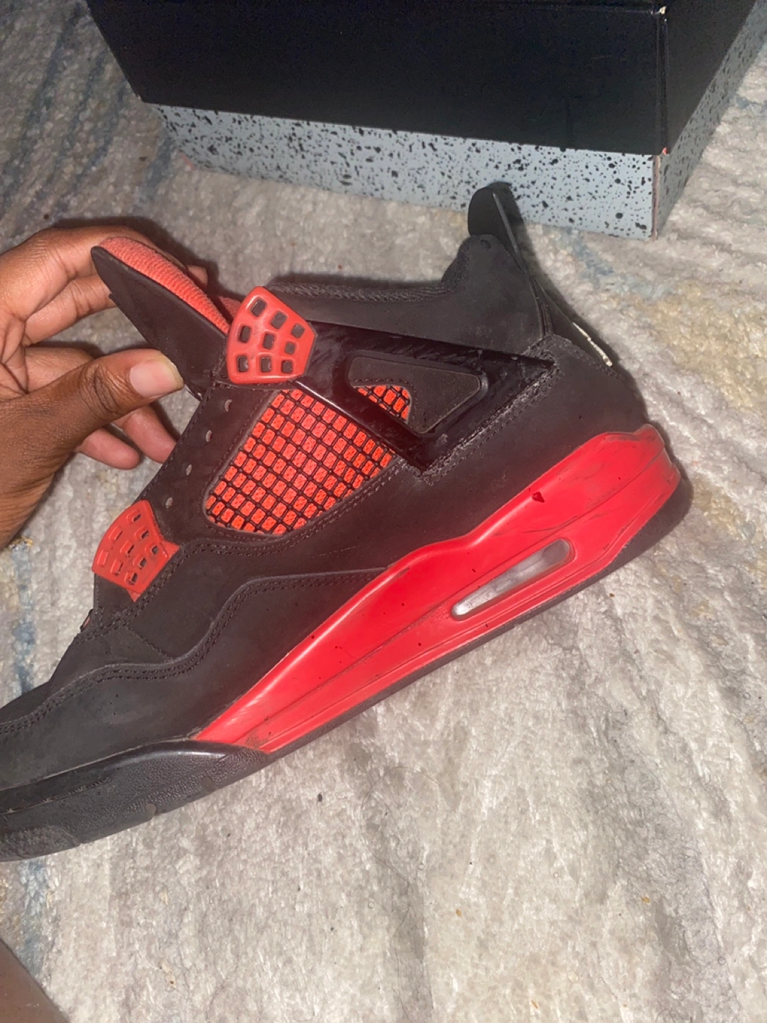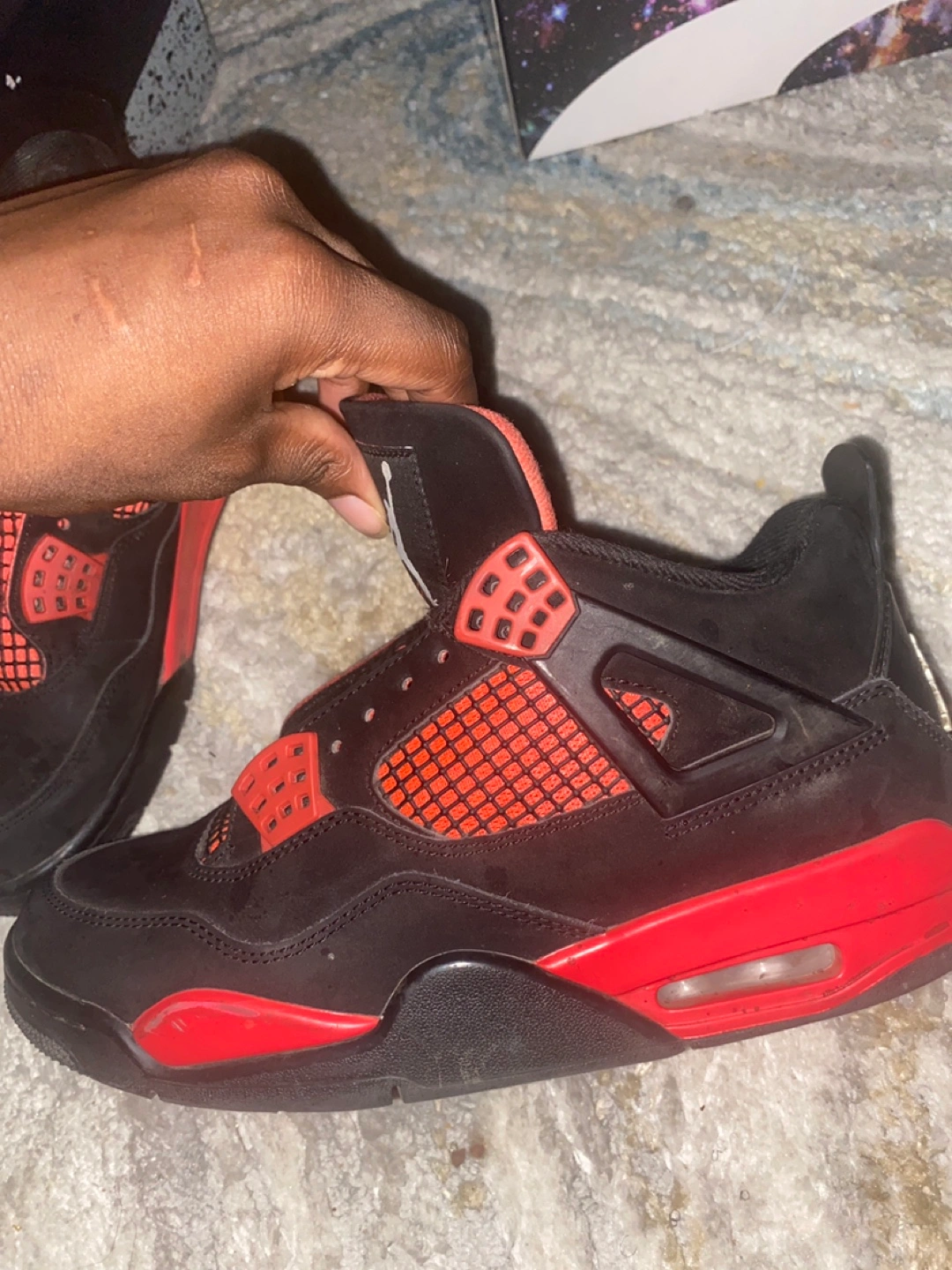 Black and red Air Jordan 4 sneakers. Slight wear. Used condition.