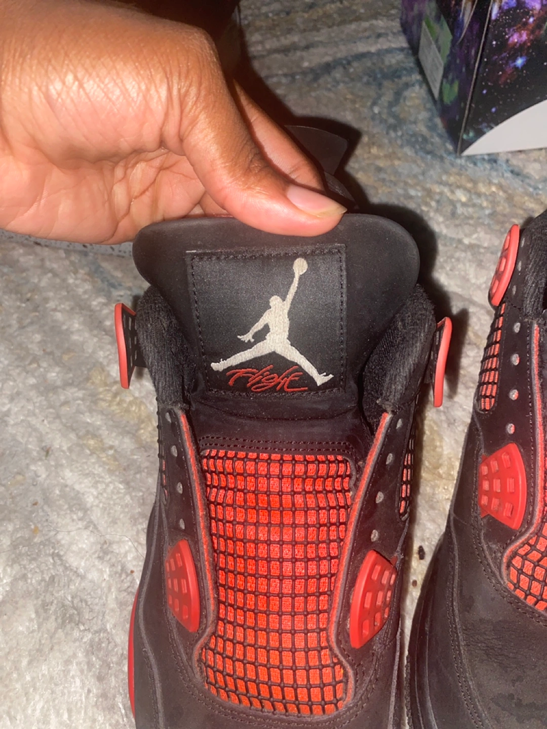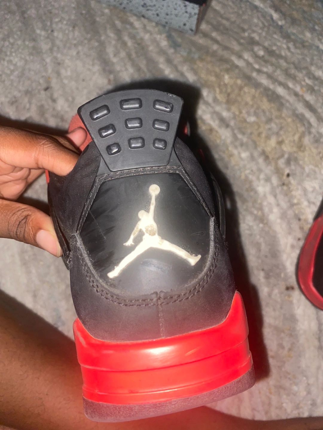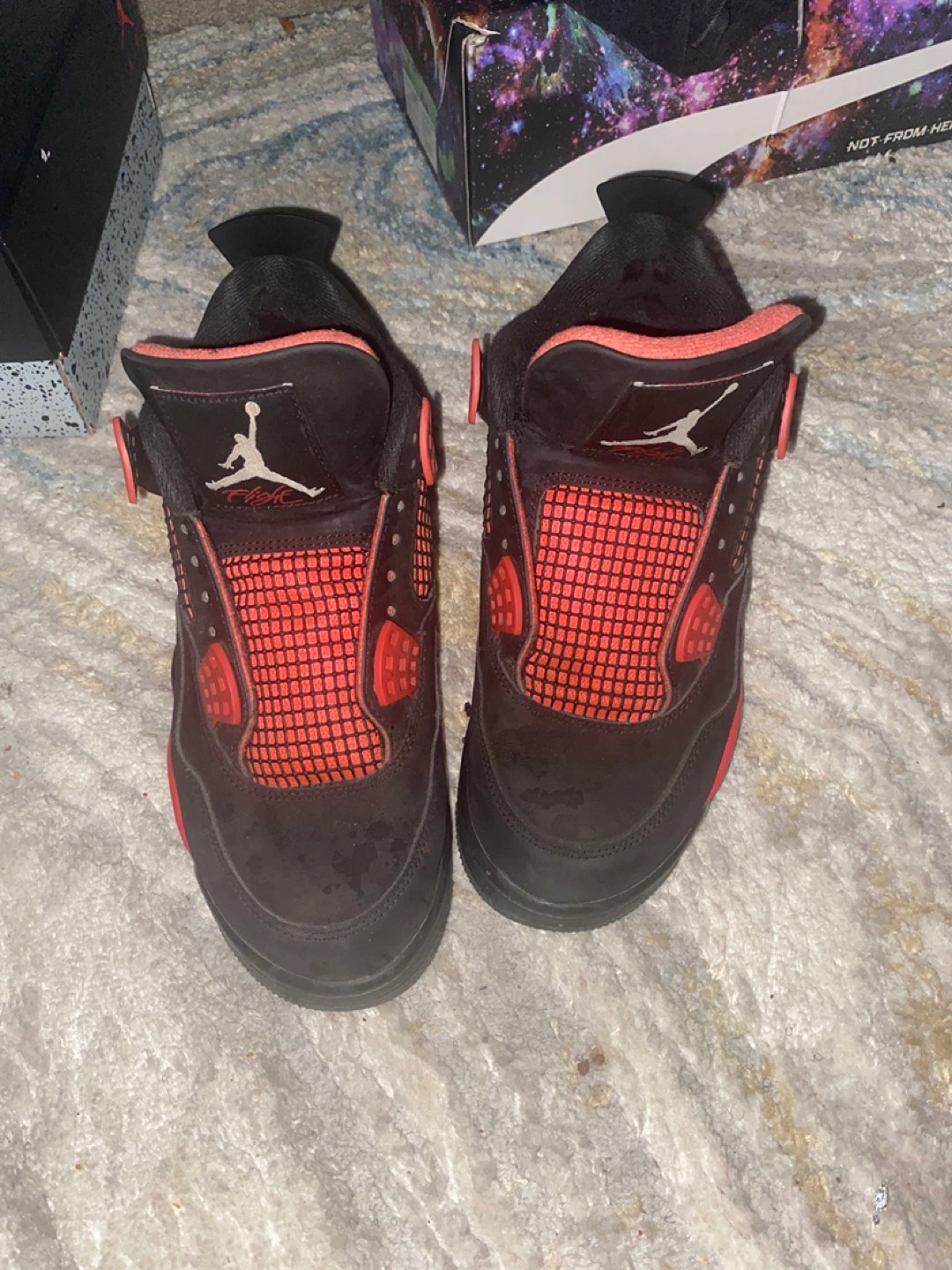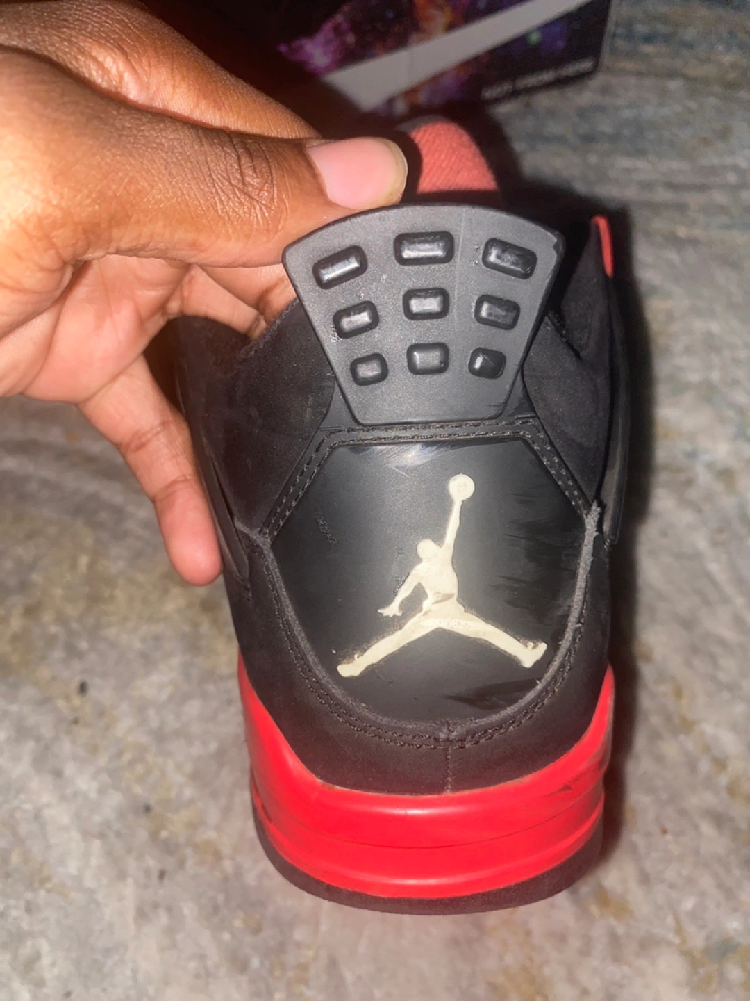 Black and red Air Jordan 4 sneakers. Slight wear. Used condition.