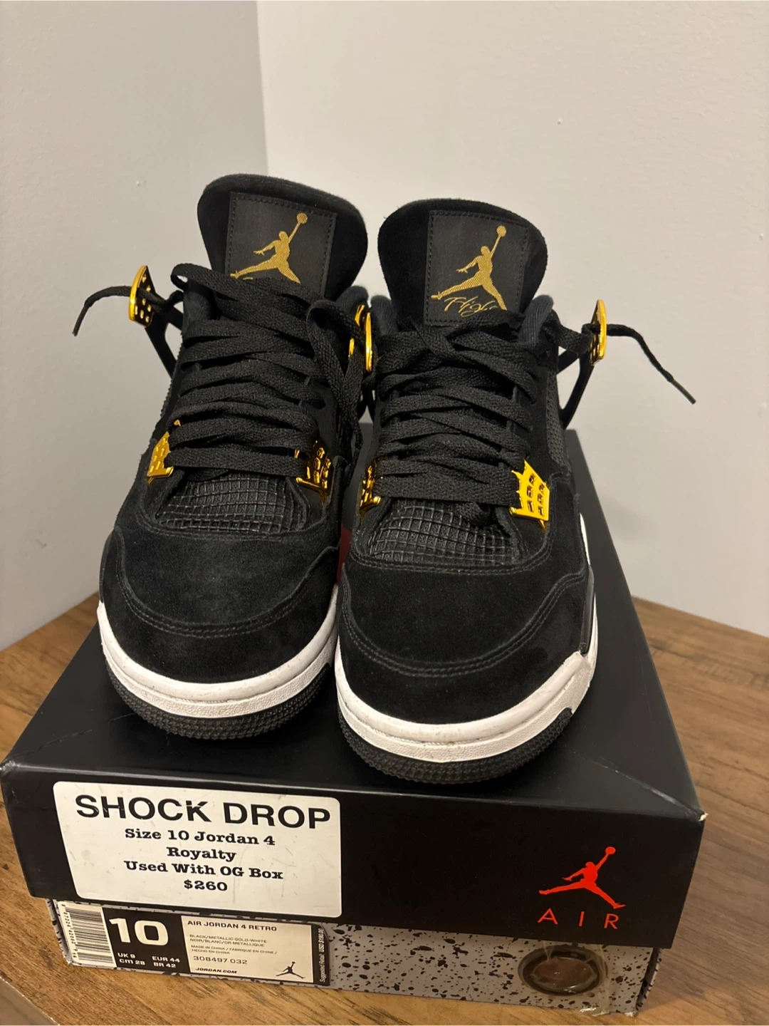 65Selling a pair of Air Jordan 4 Retro Royalty sneakers in size 10. They come with the original box. These stylish sneakers feature a sleek black design with gold accents. Originally bought for $420