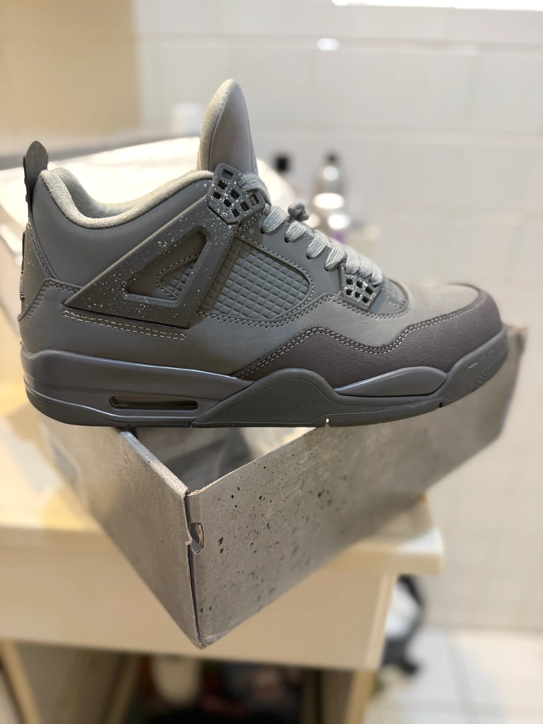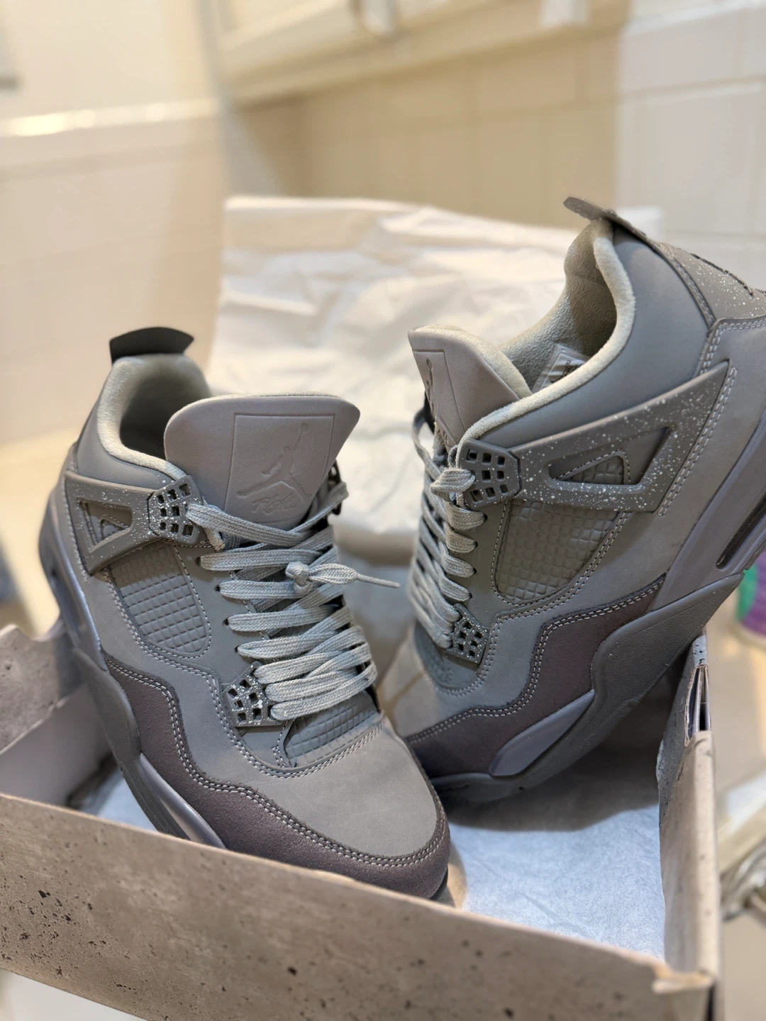 Selling a pair of Air Jordan 4 Retro Wet Cement sneakers in the Carbon Grey color. They are a US size 11 and come with the original box. Worn twice tops. Great condition. Great for any sneaker enthusiast!