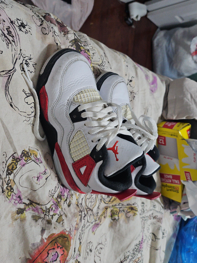 Selling a pair of Air Jordan 4 Retro sneakers in white and red. They are in good condition, perfect for casual wear or adding to your collection!