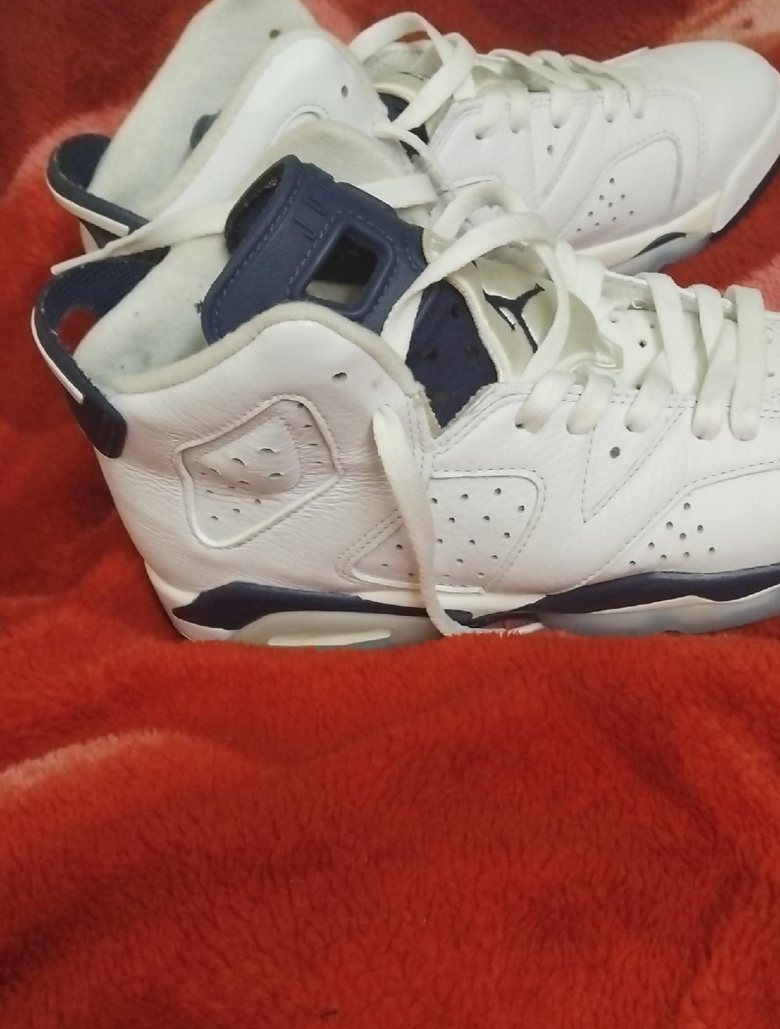 CASH ONLY! Selling a pair of Air Jordan 6 Retro sneakers in white and midnight navy. These classic kicks are in good condition and ready for a new home! They feature the iconic Jumpman logo and a stylish design that's perfect for any sneakerhead.