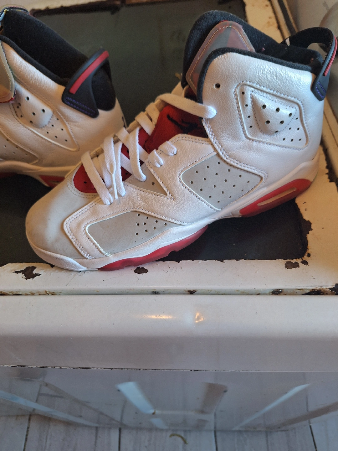 Selling a pair of Air Jordan 6 Retro sneakers in white and red. They show some signs of wear but are still in good condition for casual wear or collecting. Please check the photos for a better idea of the condition