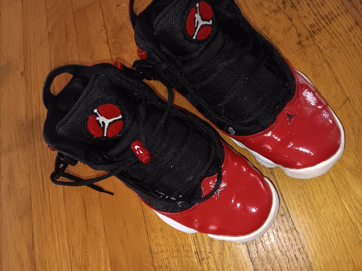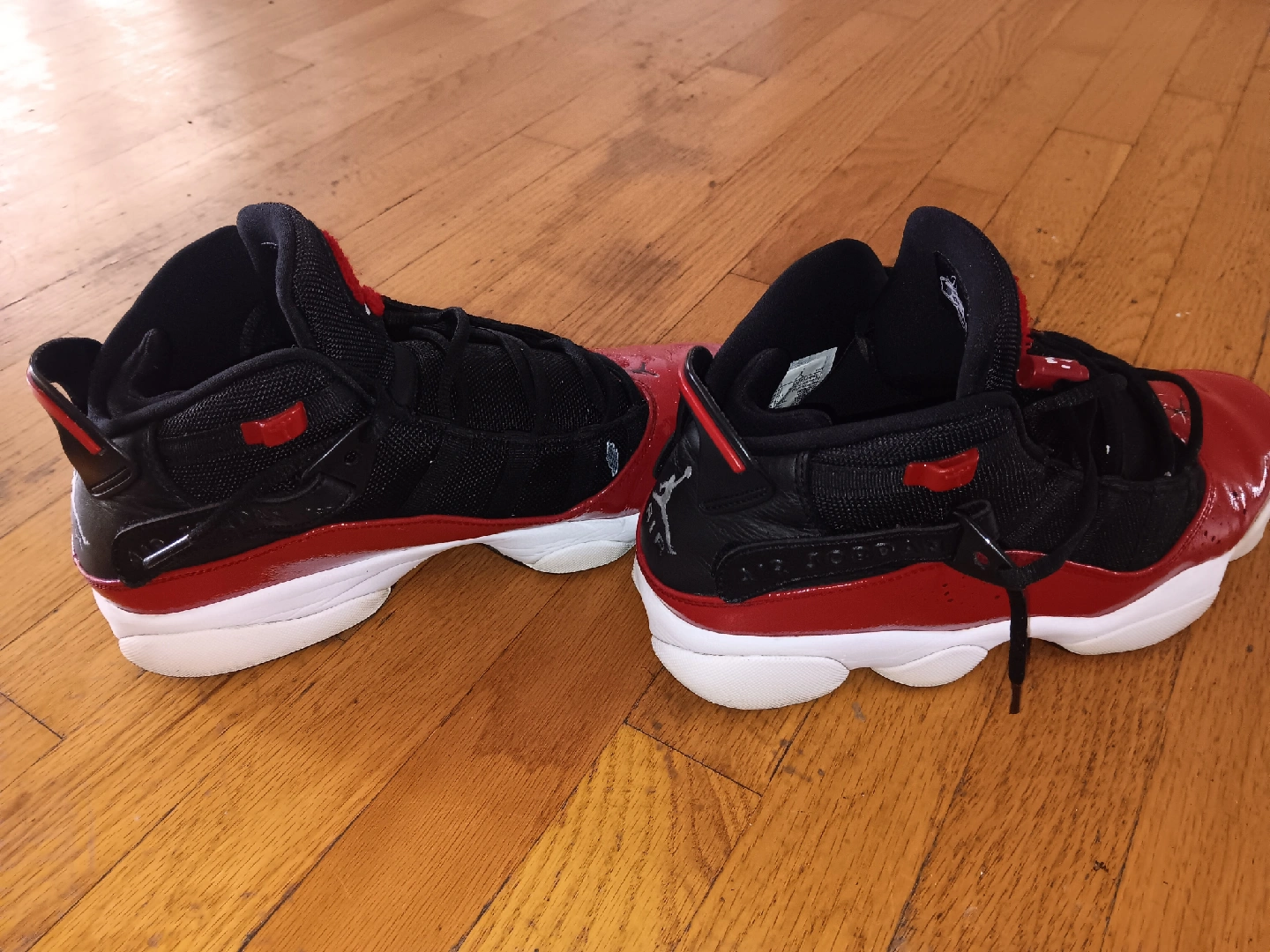 Selling a pair of Air Jordan 6 Rings toddler shoes in size 6. They feature a stylish black and red colorway. Great for your little one!