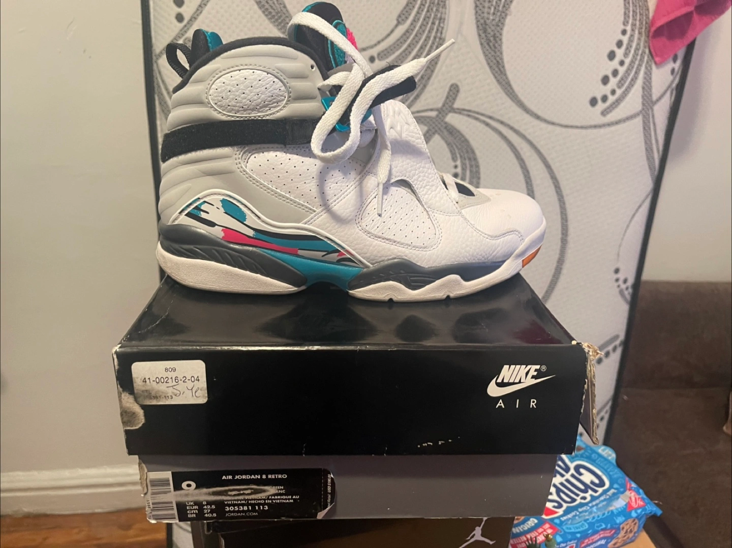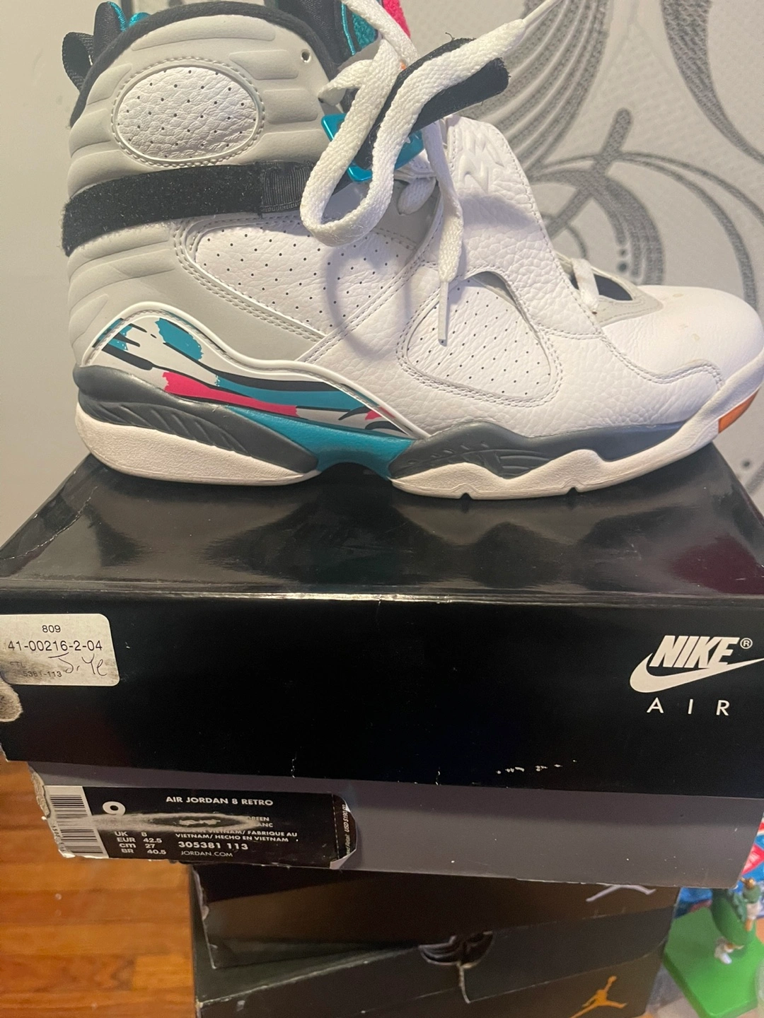 Men's Air Jordan 8 Retro sneakers. Size 42.5. Aqua colorway. Original box included. Pre-owned.