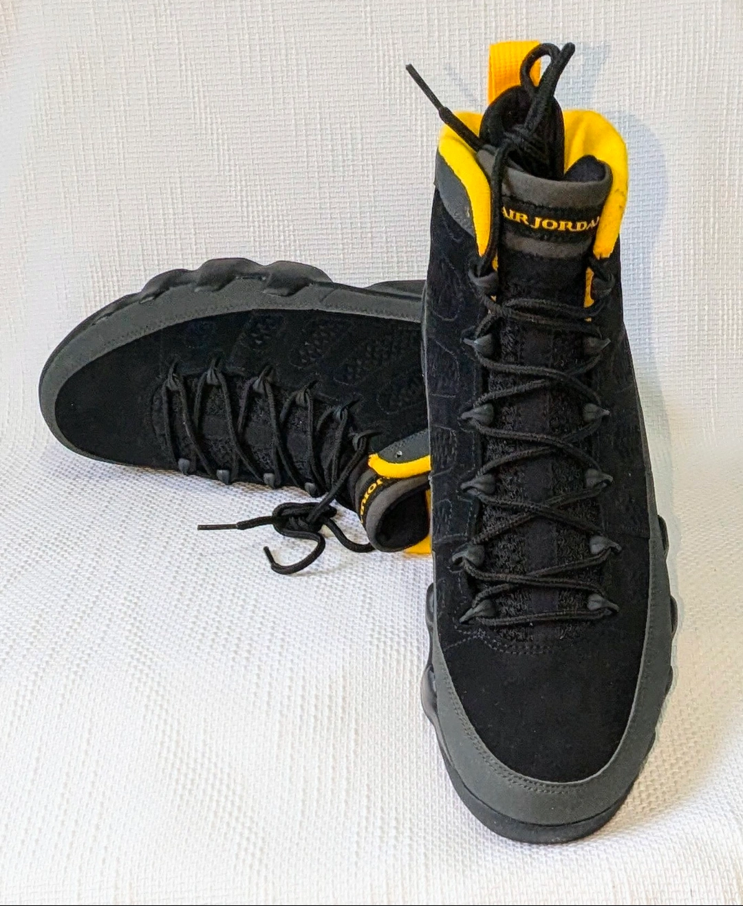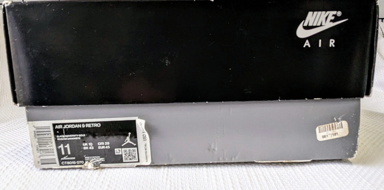 RARE NEW ct8019070 AIR JORDAN 9 RETRO DARK CHARCOAL UNIVERSITY Brand New with box *** BOX NOT IN GOOD CONDITION *** Size US11 Brand: Nike Style Sneaker Style Code CT8019-070 UPC 00194501118217 Model: Air Jordan 9 Type Athletic Feature Shoe Shaft Style: Mid Top Color Dark Charcoal University Gold Release Year 2021