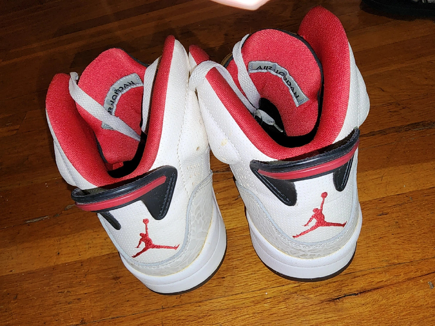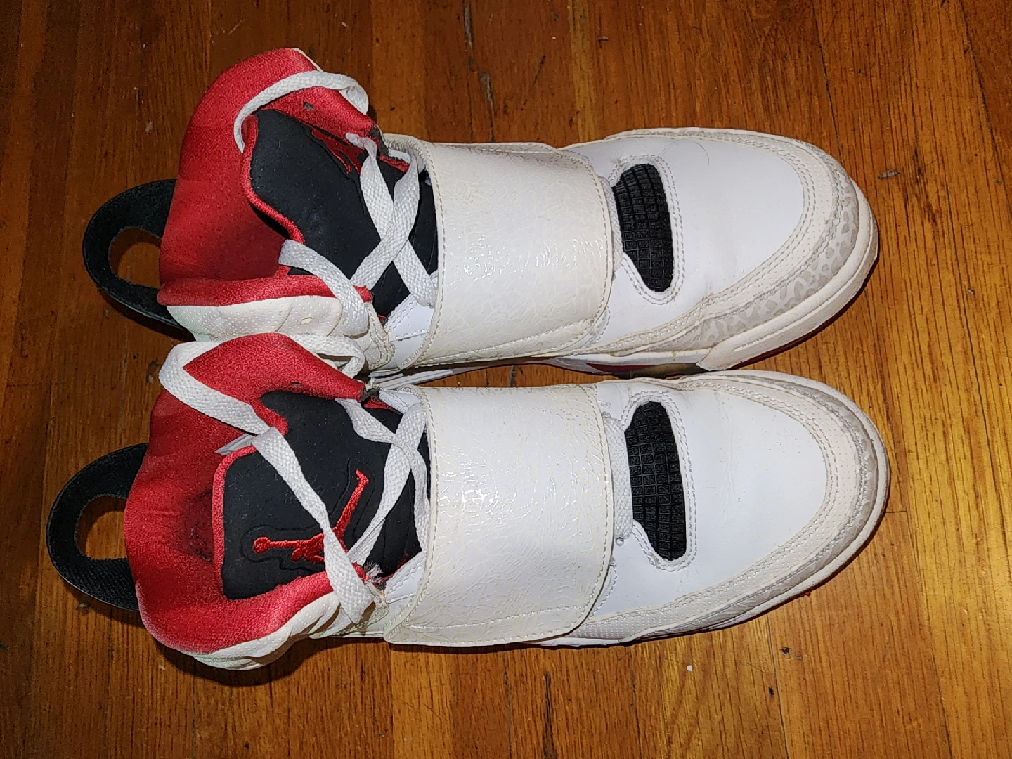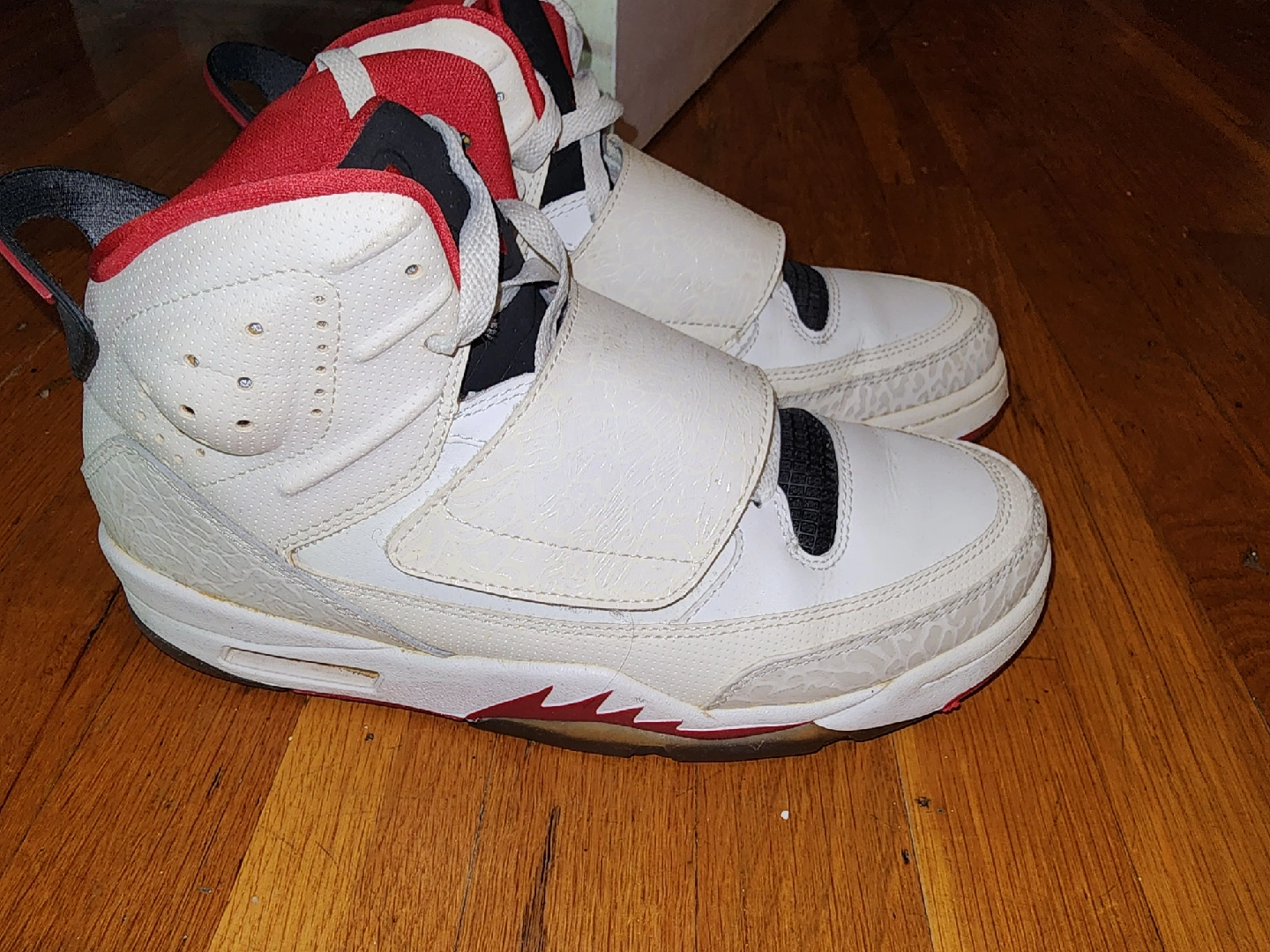15Selling a pair of Air Jordan Son of Mars sneakers. They're white, red, and black. They have a strap across the laces and the Jumpman logo on the back
