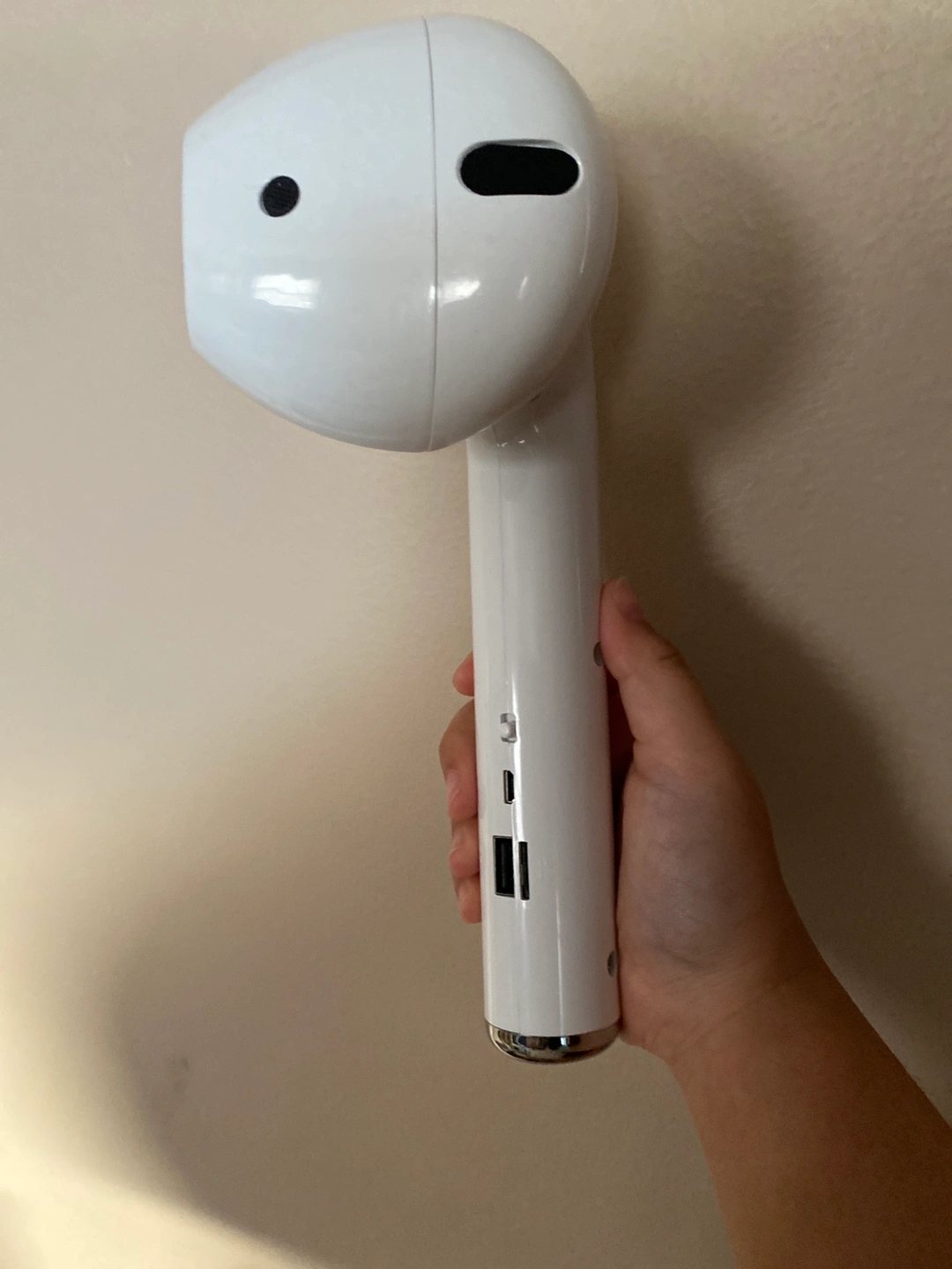 This is a fun and unique speaker shaped like an Airpod. It comes with charging cables. The speaker features a microphone and hands-free calling functionality. The speaker plays music from a micro SD card, Bluetooth or USB drive.