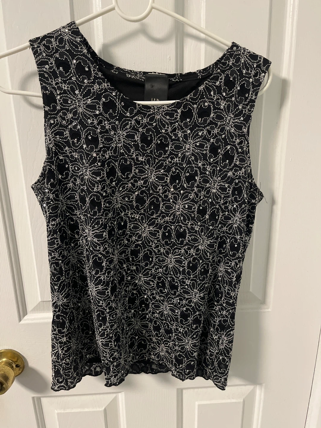 Sparkly black sleeveless top with a glittery floral pattern. It features a round neckline and a scalloped hem. This top is made of a lightweight, stretchy material.