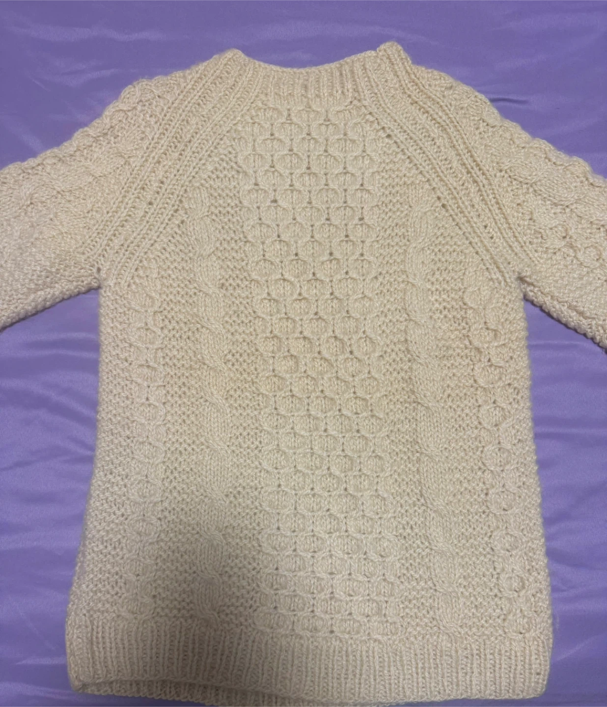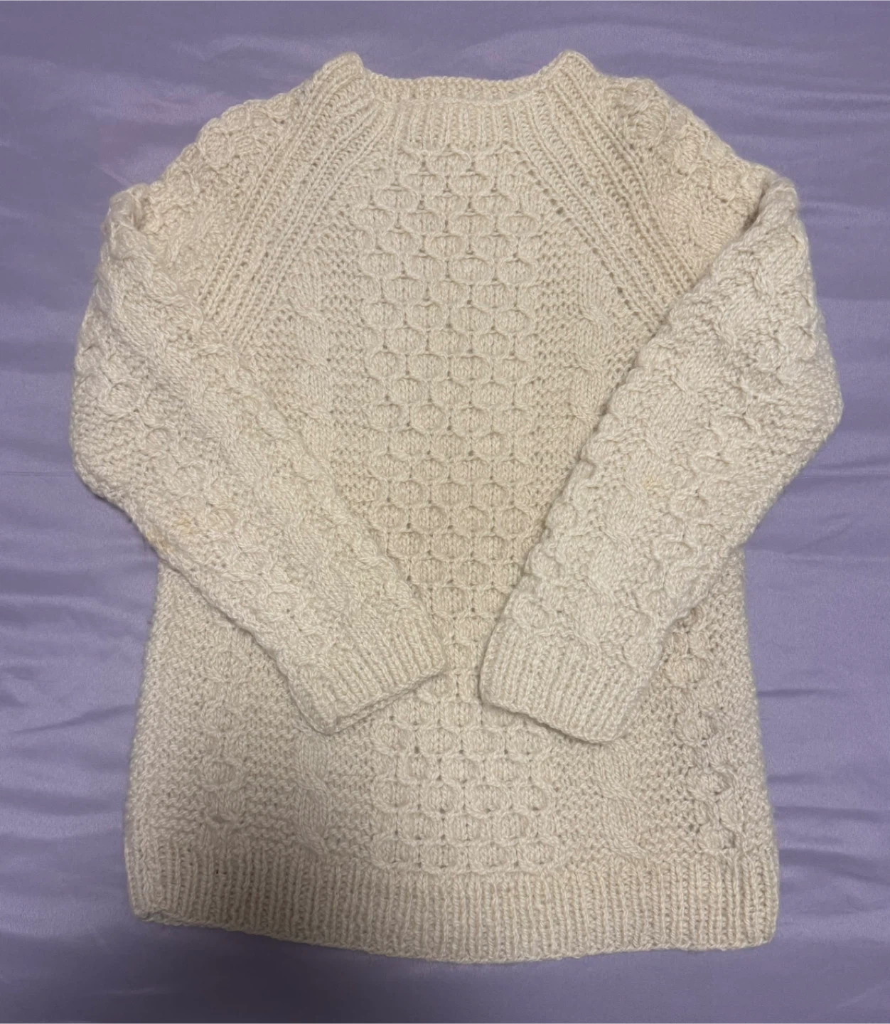 Cozy up in this lovely wool cream-colored cable knit sweater! It's perfect for layering or wearing on its own for a classic, comfortable look. The intricate cable knit design adds a touch of sophistication to any outfit