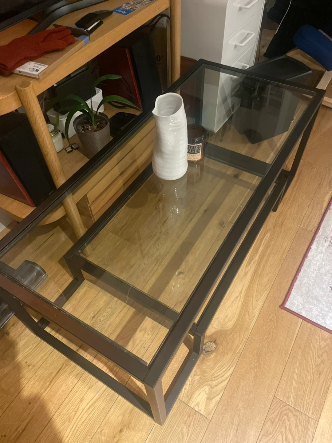Stylish coffee table with a sleek metal frame and clear glass top. It features a lower shelf for extra storage. Also works as a TV console