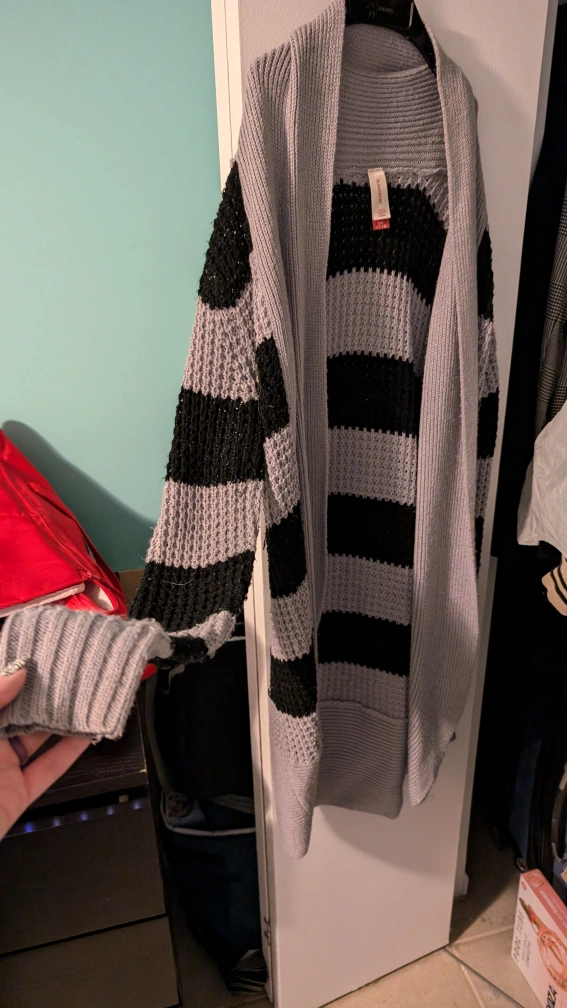 Gray and black striped cardigan. Long sleeves. Open front. Size Large. From home with dogs. Chicago 60618